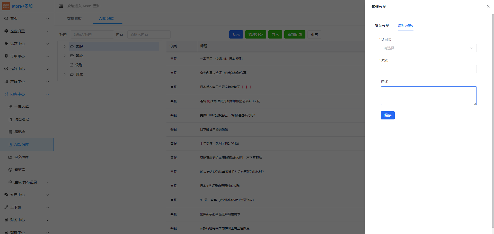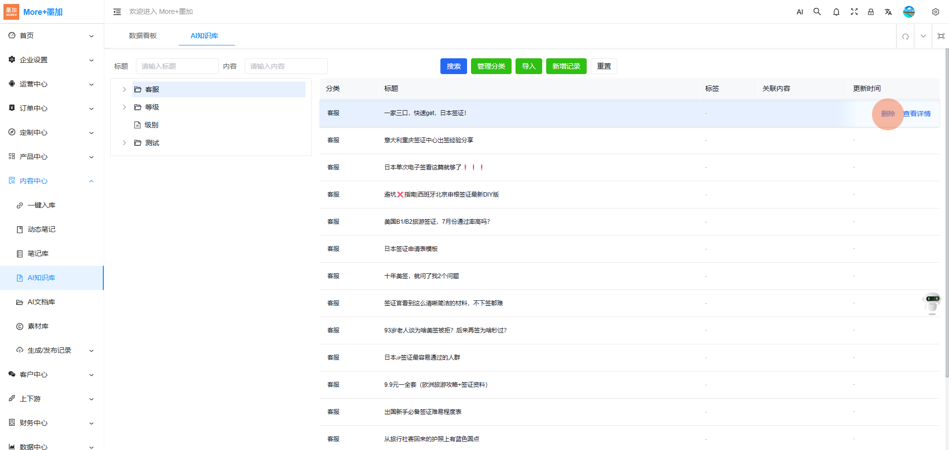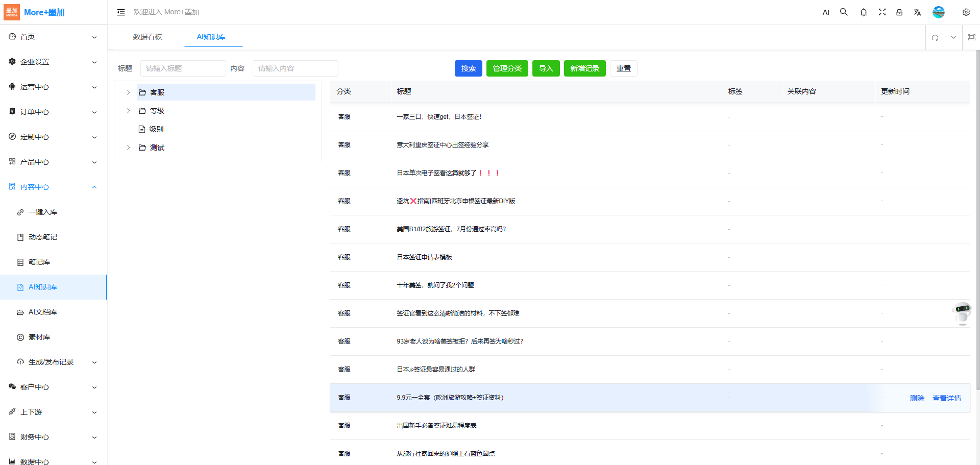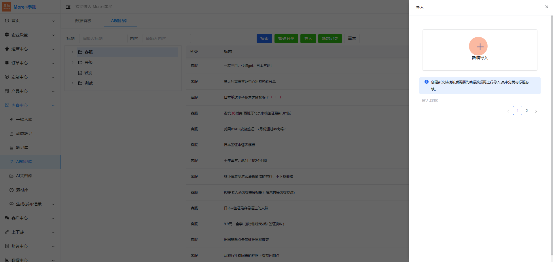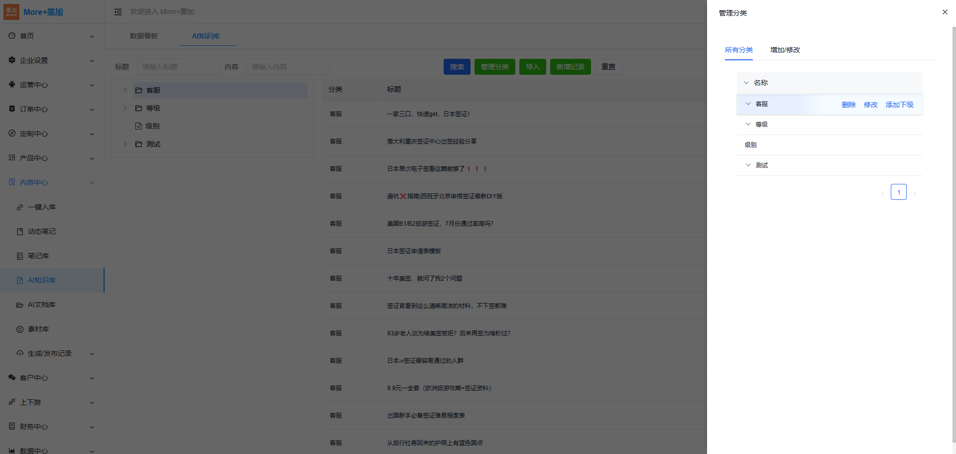 - 点击:【内容中心-知识库】,主要功能在于完善AI大模型的知识库,在AI客服或者客服助手在咨询对应产品时,AI会优先匹配知识库和文档库内的数据进行回答。知识库内可以进行增加、删除修改、查询、管理分类、和导入功能。
