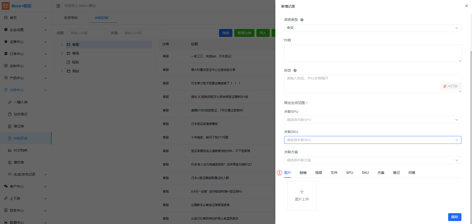附件①: 上传图片、视频、文件、输入链接、选择SPU、SKU、方案、笔记、问卷等附加后,在AI匹配到当前条目时会返回当前附件到客户的咨询界面,客户可以查看图片、查看链接、查看产品卡片等方式吸引客户。