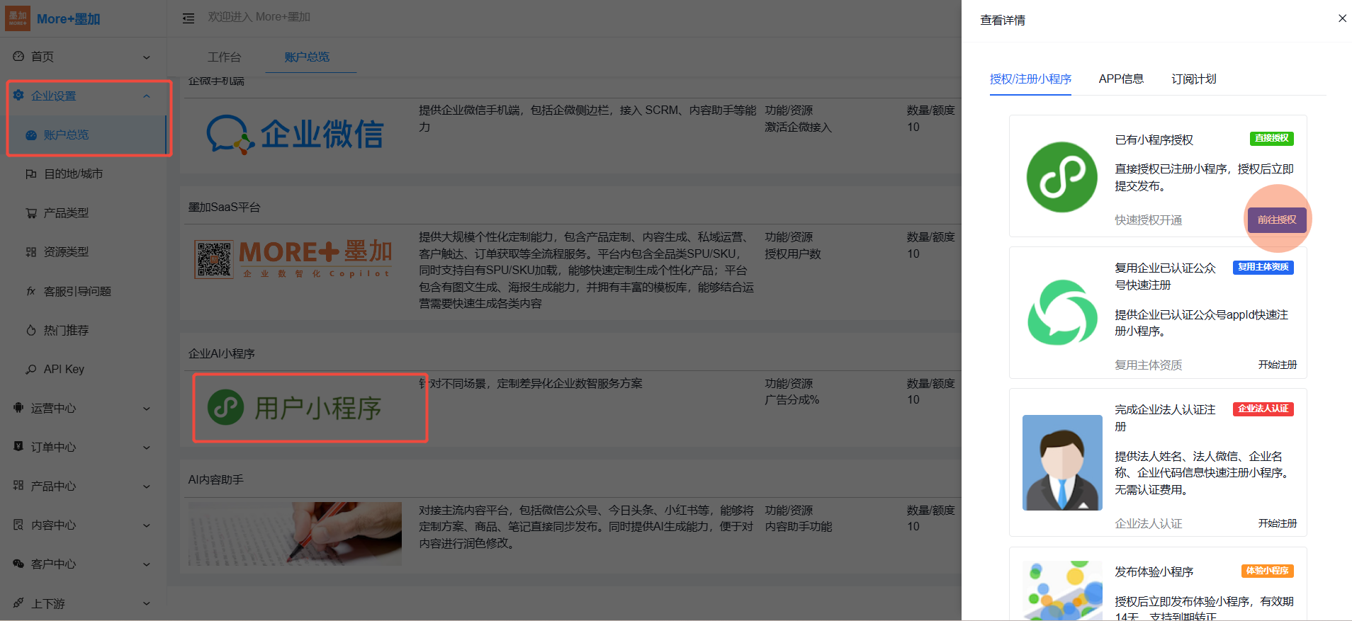 - 进入【企业设置-账户总览-用户小程序-查看详情】,点击【已有小程序授权-前往授权】,管理员微信扫码,选择相应小程序,并确认授权
