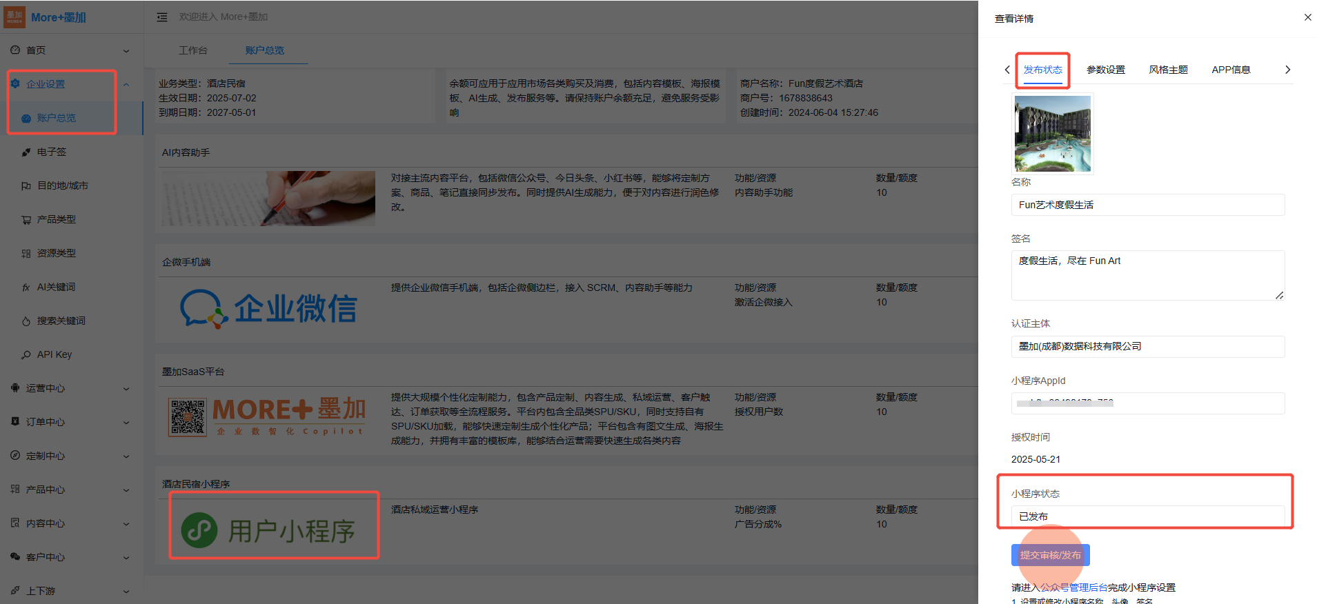- 进入【企业设置-账户总览-用户小程序-查看详情】,在【发布状态】中操作小程序【提交审核/发布】,并查看小程序发布状态,显示发布成功时可正常展示