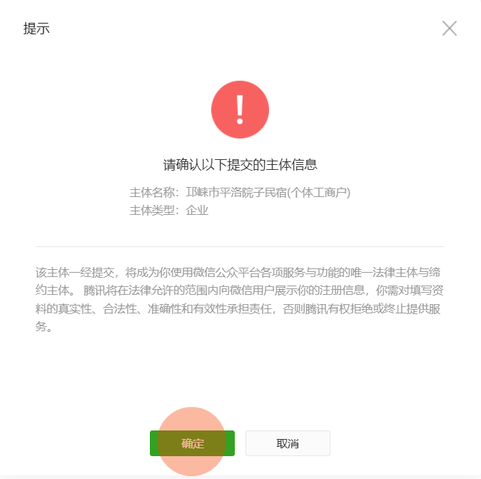 3.管理员微信扫码确认后,提示确认提交的主体信息不可变更,小程序注册成功