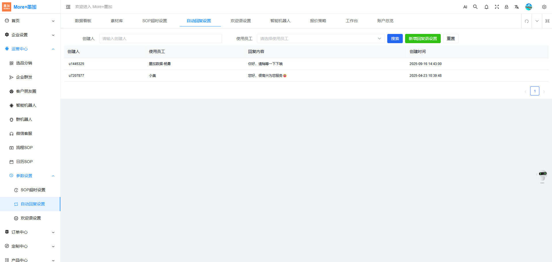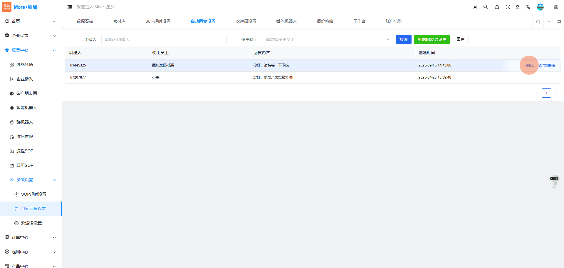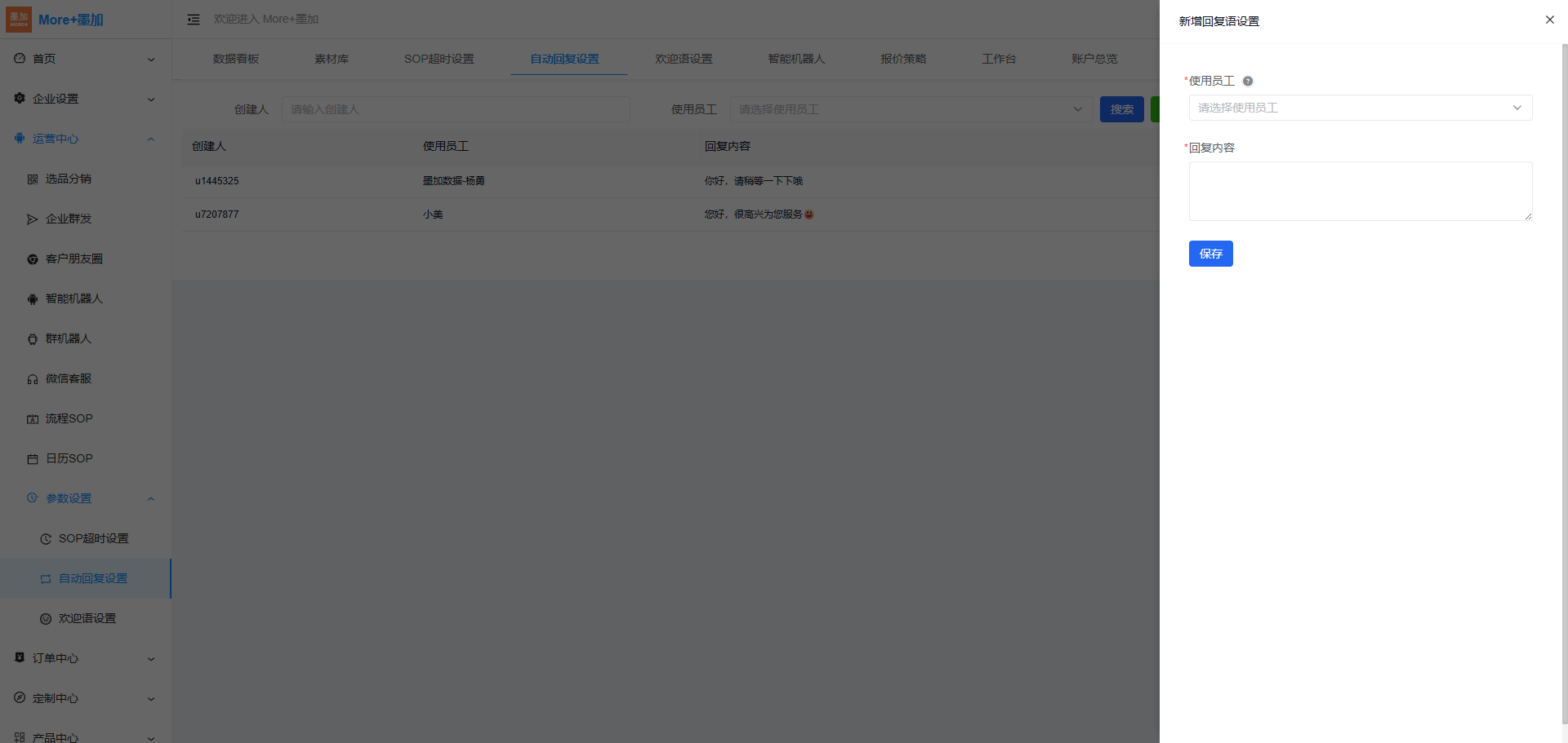 点击【新增】后选择对应的客服员工和提前设置的回复语内容即可完成设置。