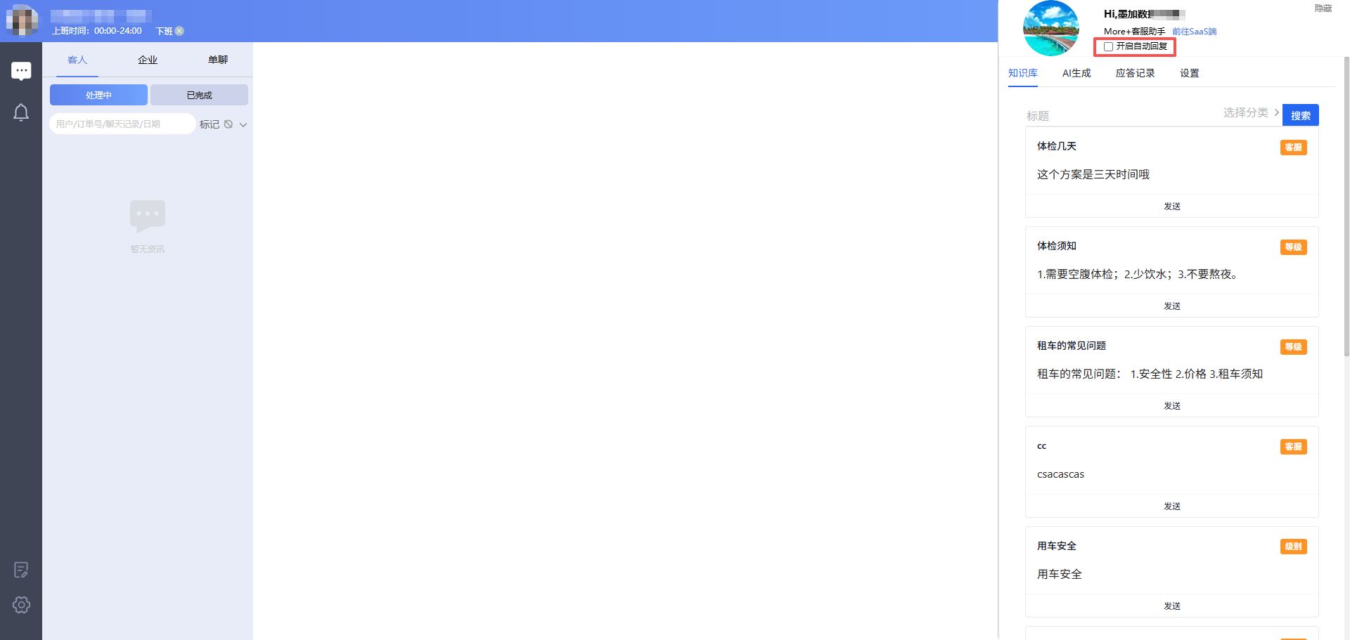 点击:【运营中心-自动回复设置】主要支持在第三方平台使用客服助手时,企业客服人员在客服助手侧边栏内开启自动回复,即可在回复超时后,系统自动根据设置的回复内容进行自动回复的功能。