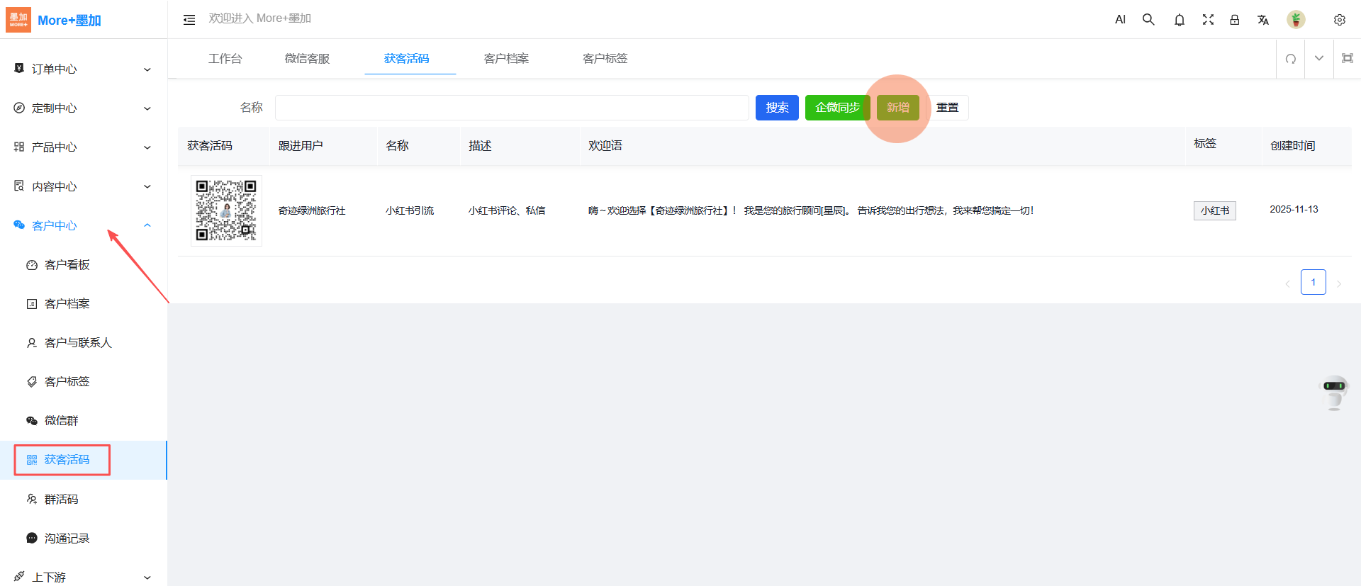 - 进入【客户中心-获客活码】,点击【企微同步/新增】
