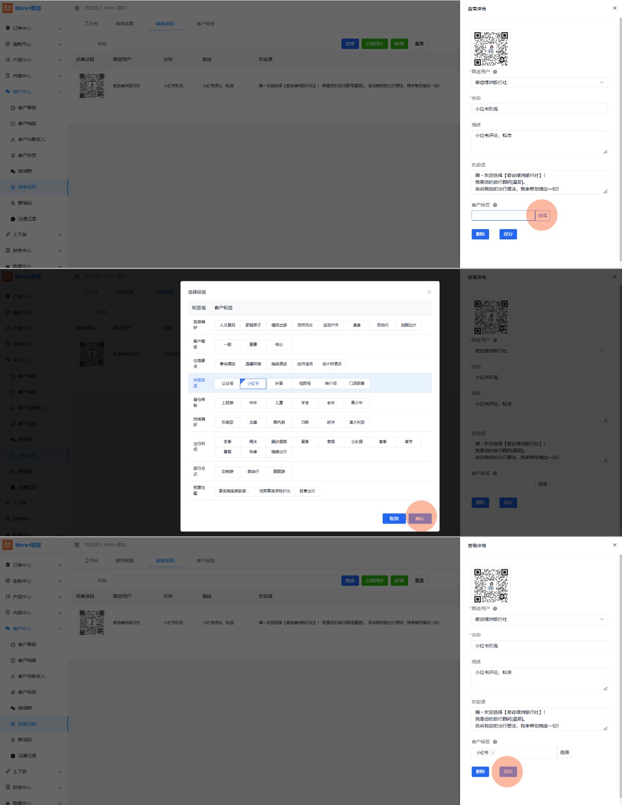 前往【墨加后台】创建获客活码,点击【客户标签】为活码设置专属标签,选择对应的跟进人员,通过此活码添加的客户将自动带上相应标签
