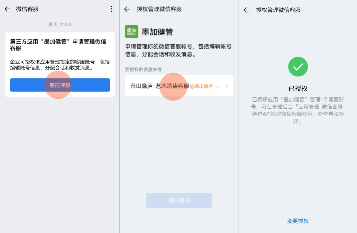 - 企业微信管理员收到微信客服的消息通知,并前往授权(手机端)