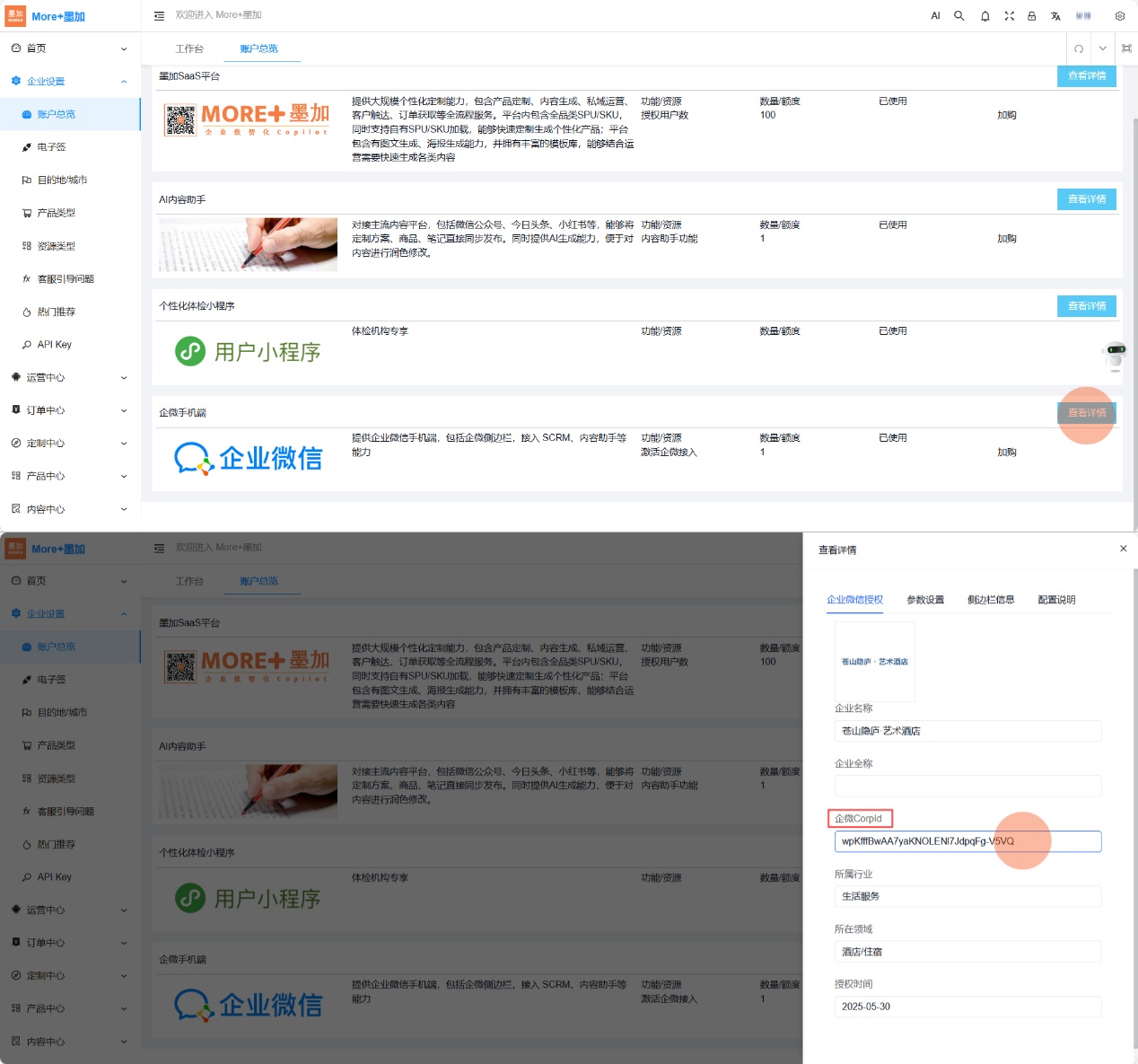- 登录墨加后台,进入【企业设置-账户总览-企微手机端-查看详情】,查看并复制企业corpID