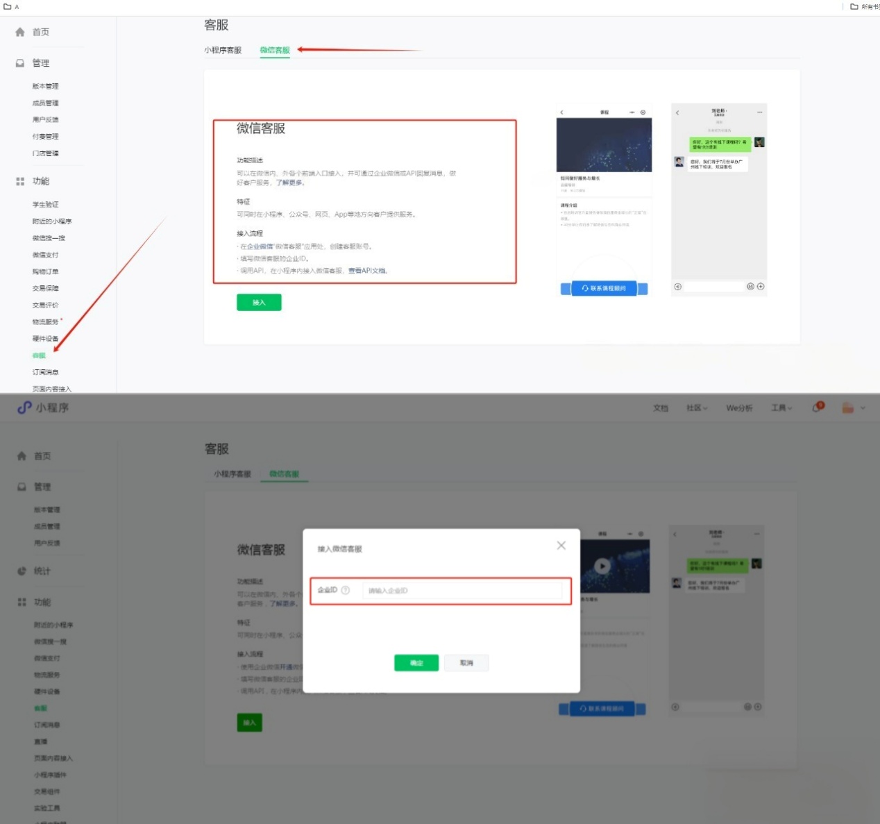 - 进入【小程序管理后台-基础功能-客服-选择微信客服】,将复制的企业 corpId粘贴进入,并点击确认即可
