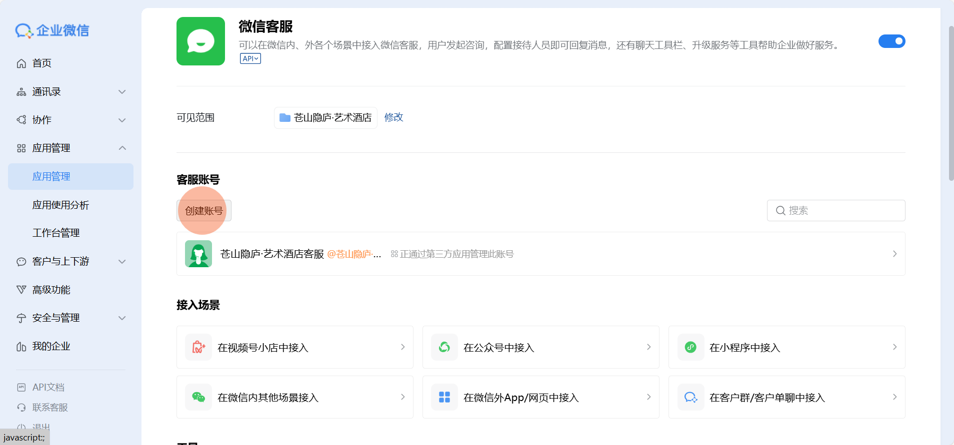 - 客服人员配置:进入【企业微信管理后台-应用管理-微信客服-创建账号】