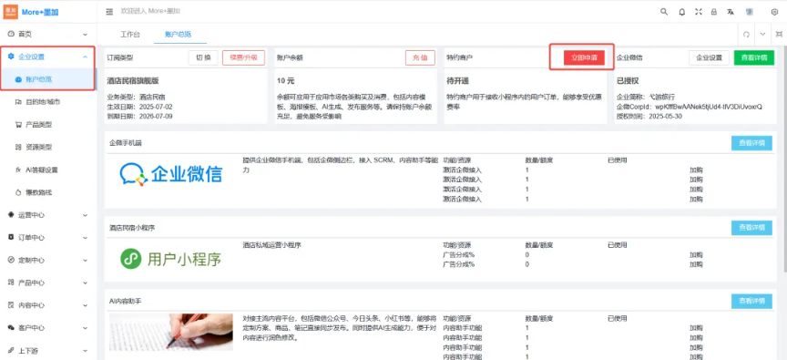 企业可通过墨加应用后台自主申请开通特约商户,以保证客户正常通过小程序下单支付及企业正常收款,通过服务商申请最优通道费率,分销及上下游自动分账