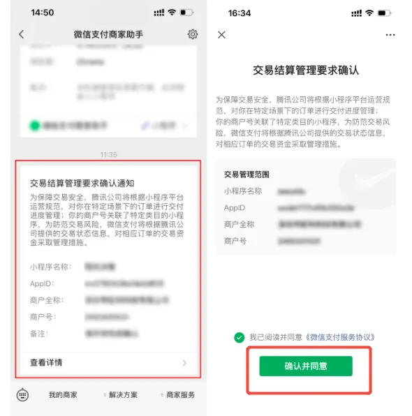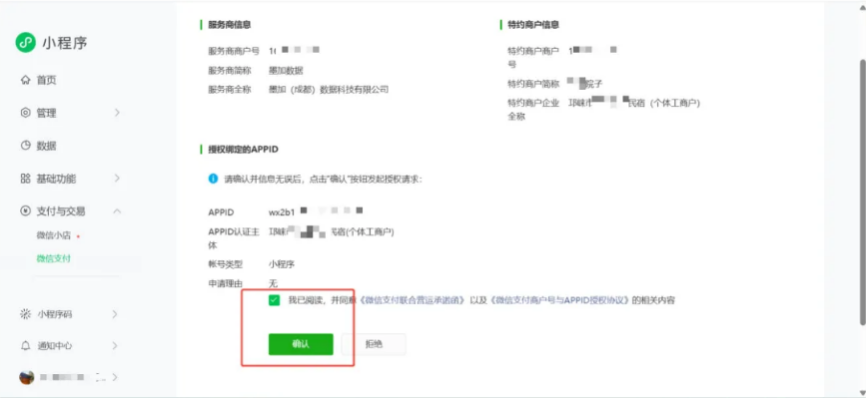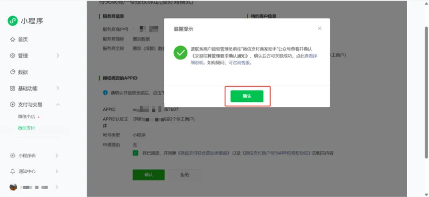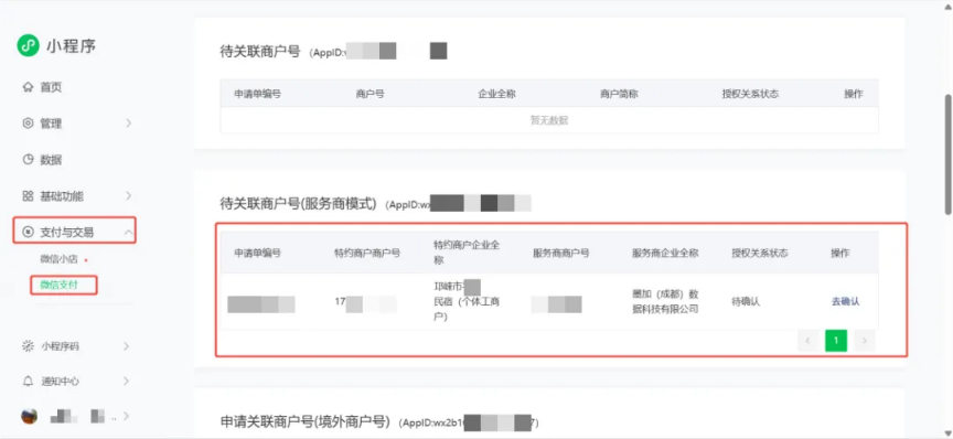 - 登录小程序后台,依次进入 【支付与交易-微信支付-待关联商户号(服务商模式)-去确认】