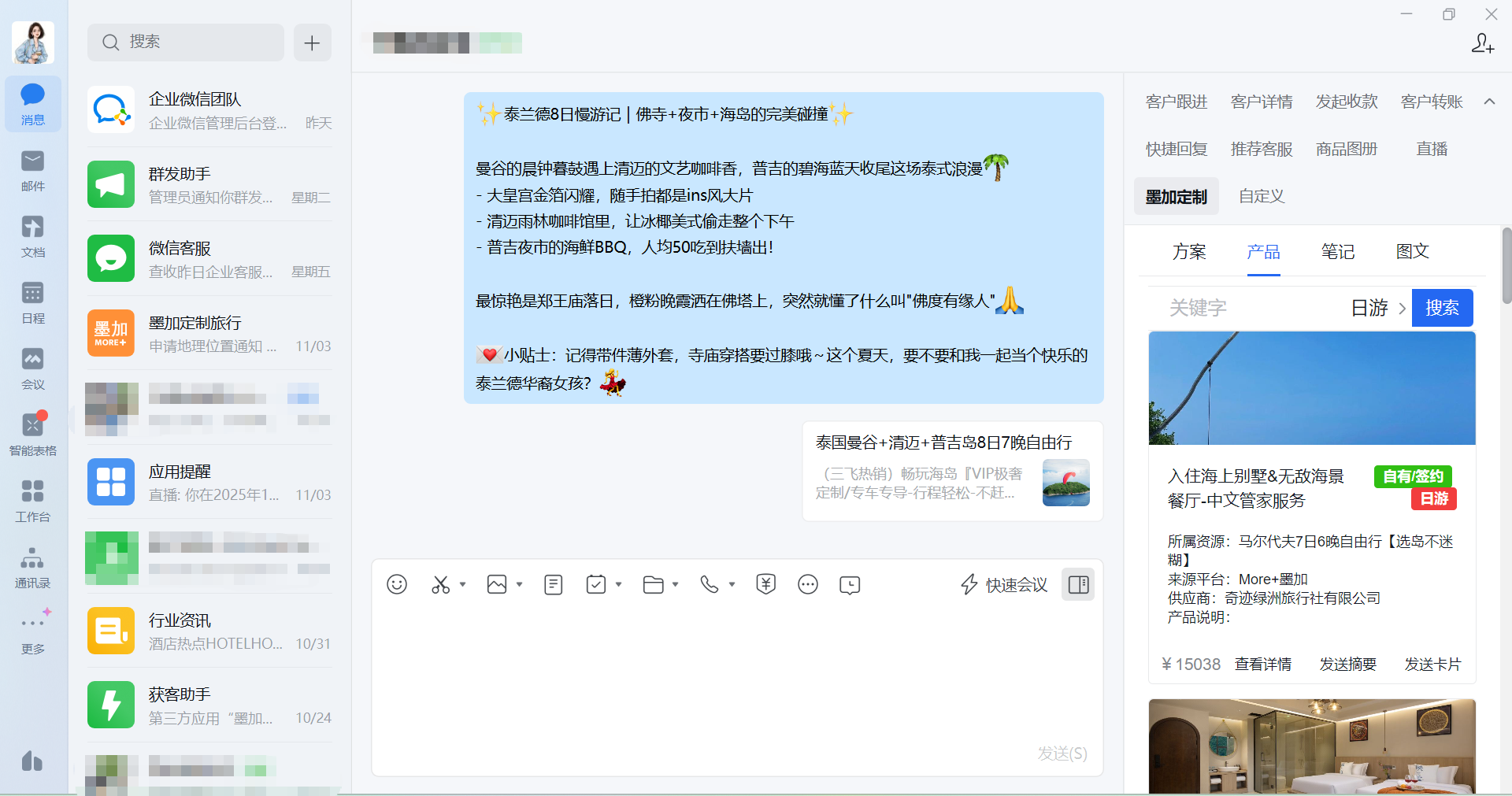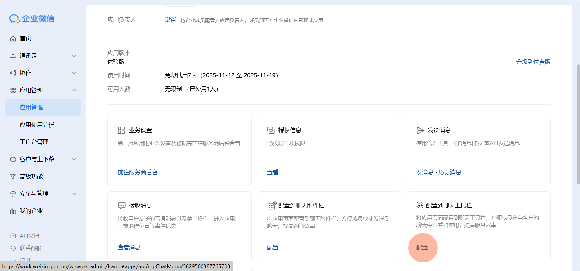 - 进入【企业微信管理后台-应用管理-找到墨加应用-点击进入应用详情-选择配置到聊天工具栏】