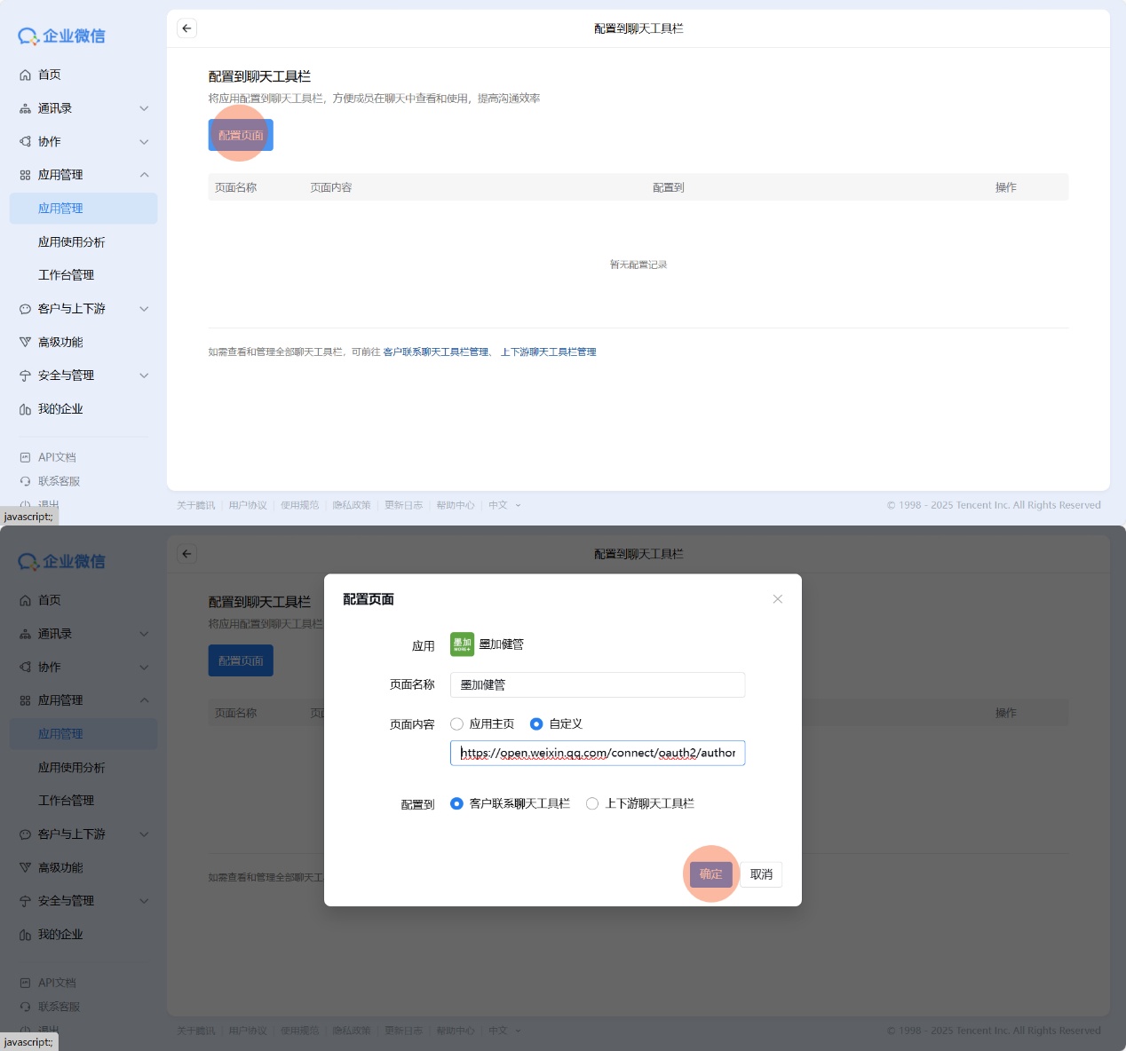 - 点击【配置页面-填写页面名称-页面内容修改为自定义-粘贴侧边栏地址链接-配置到客户联系聊天工具-点击确定】,配置成功