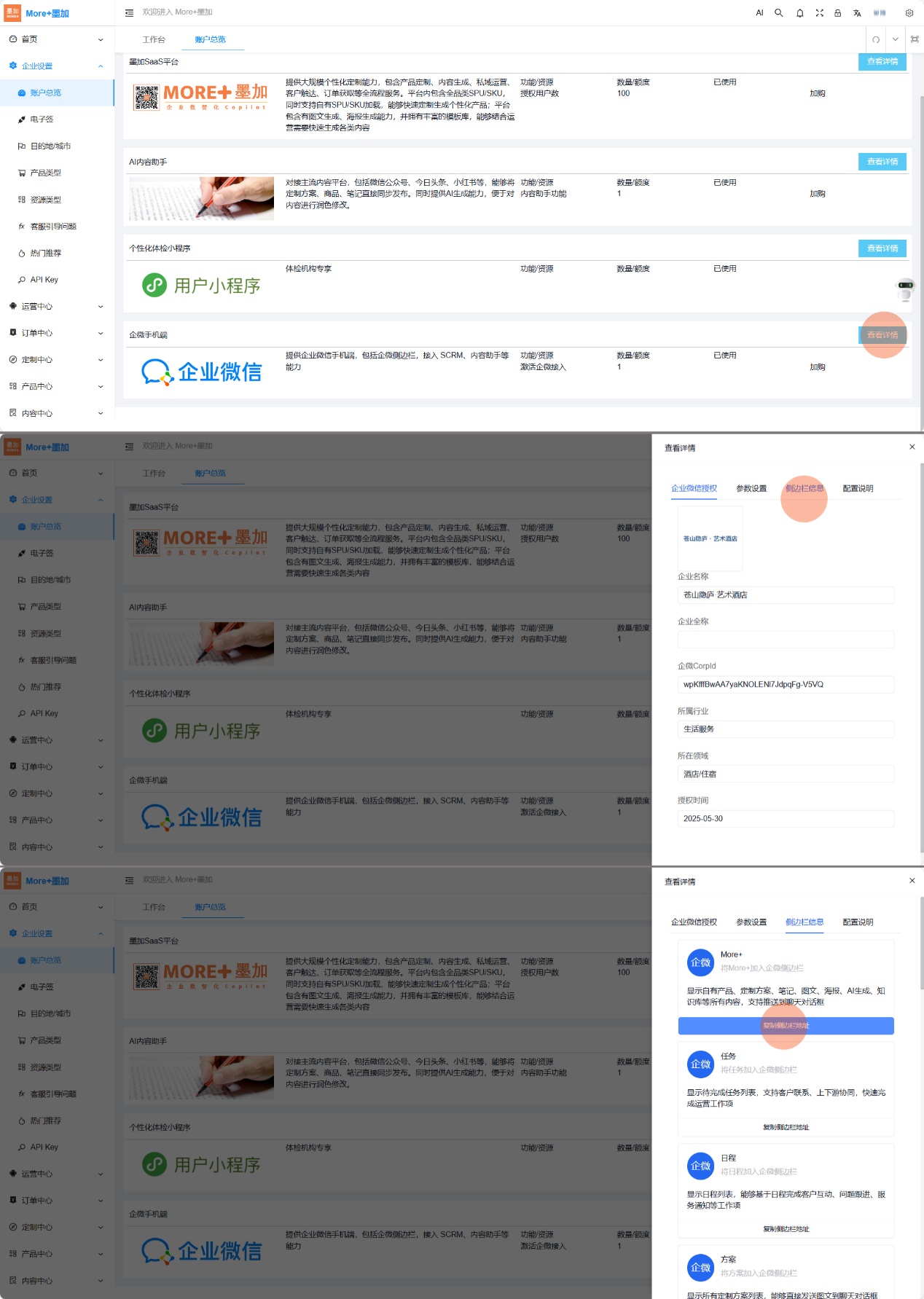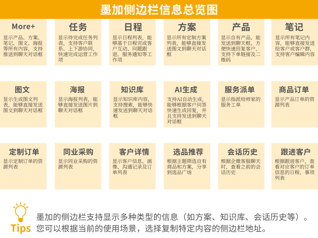 - 侧边栏地址链接获取流程:登录墨加后台-进入【企业设置-账户总览-企微手机端-侧边栏信息-复制侧边栏地址】