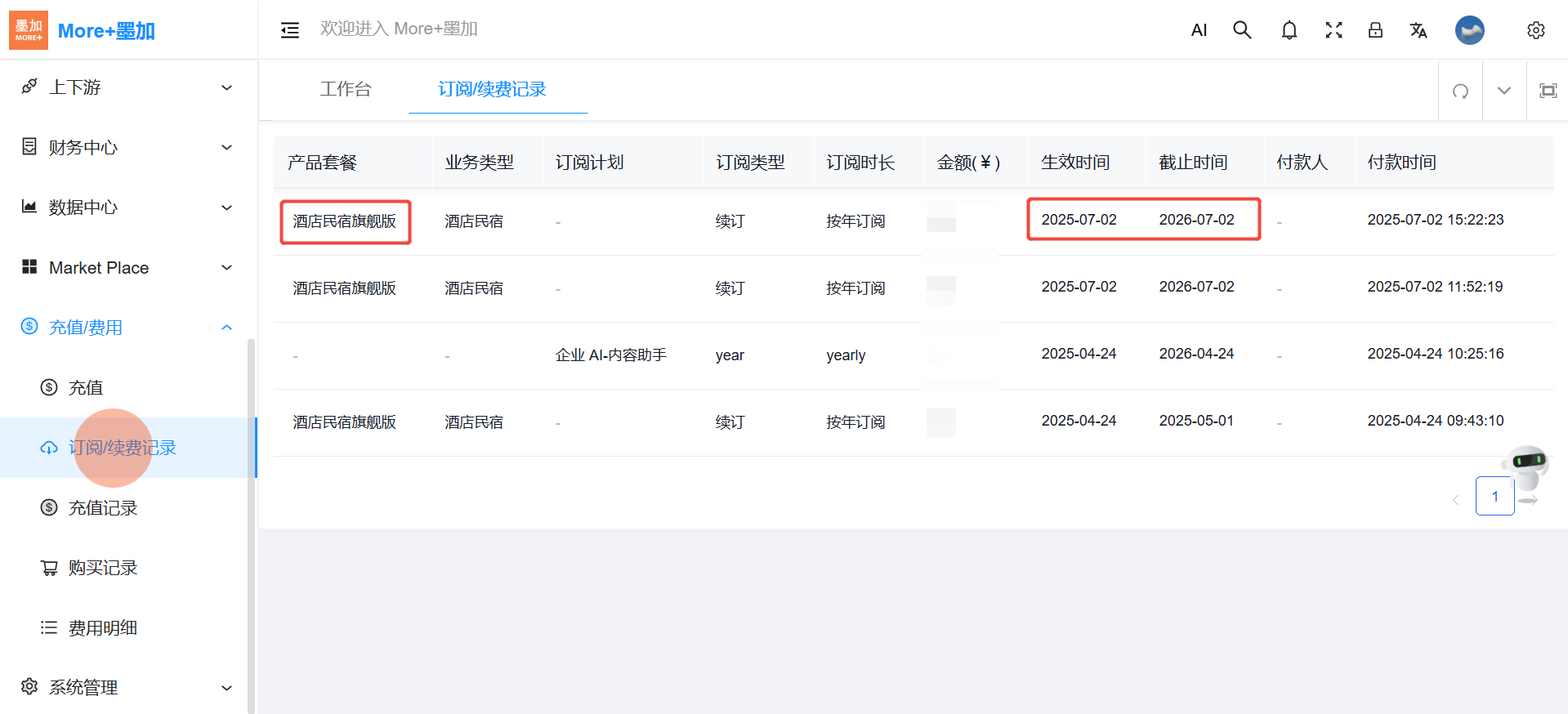 点击【充值/费用-订阅/续费记录】,可以查询应用订阅的版本、订阅金额、订阅周期及具体付款时间等详情,为避免使用中断,请于截止时间前及时续费