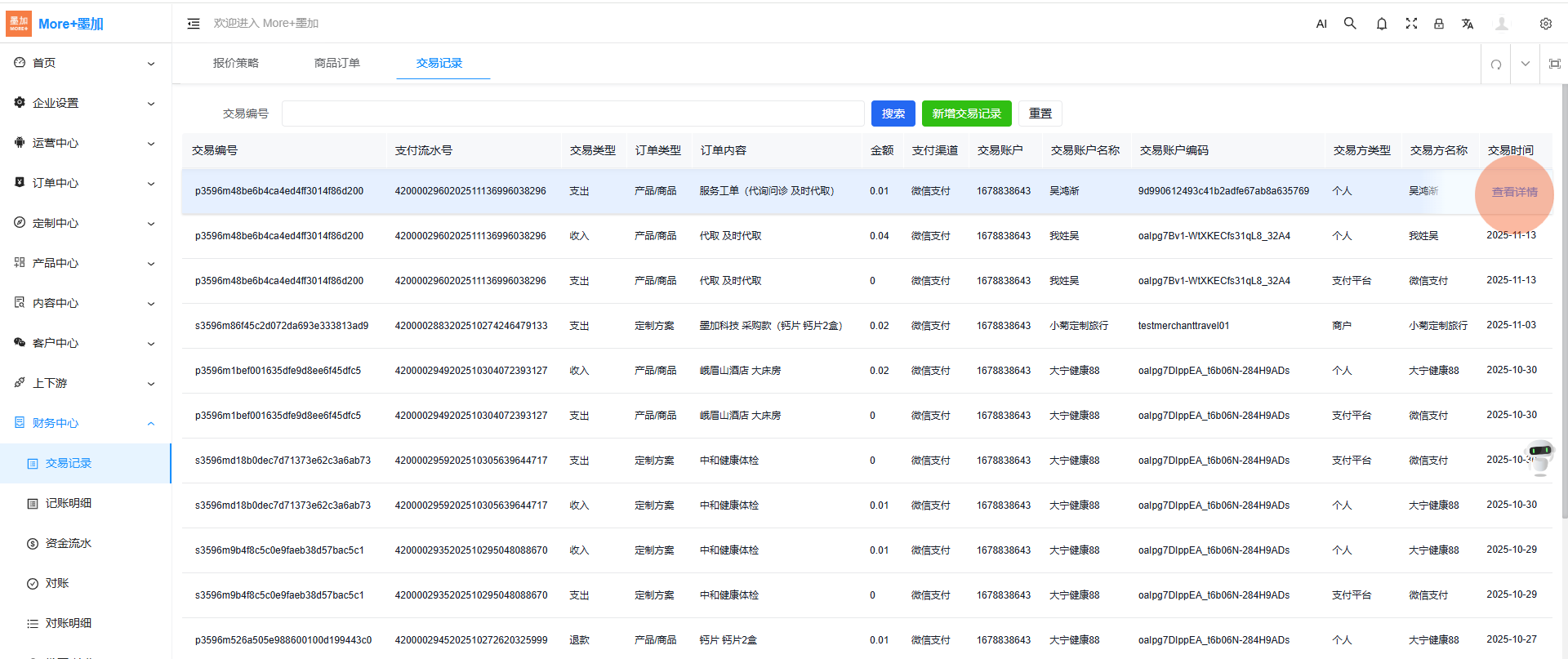 1. 点击:【财务中心-交易记录】可以查看到所有的交易记录。