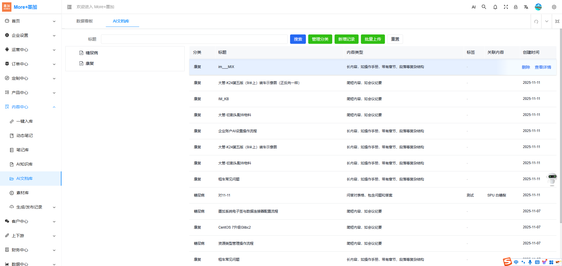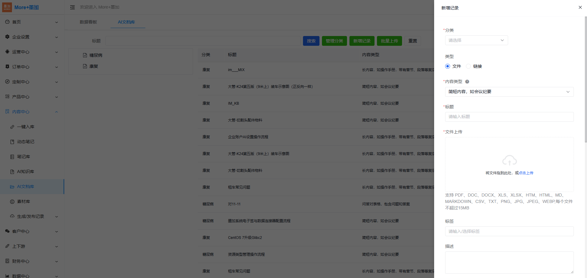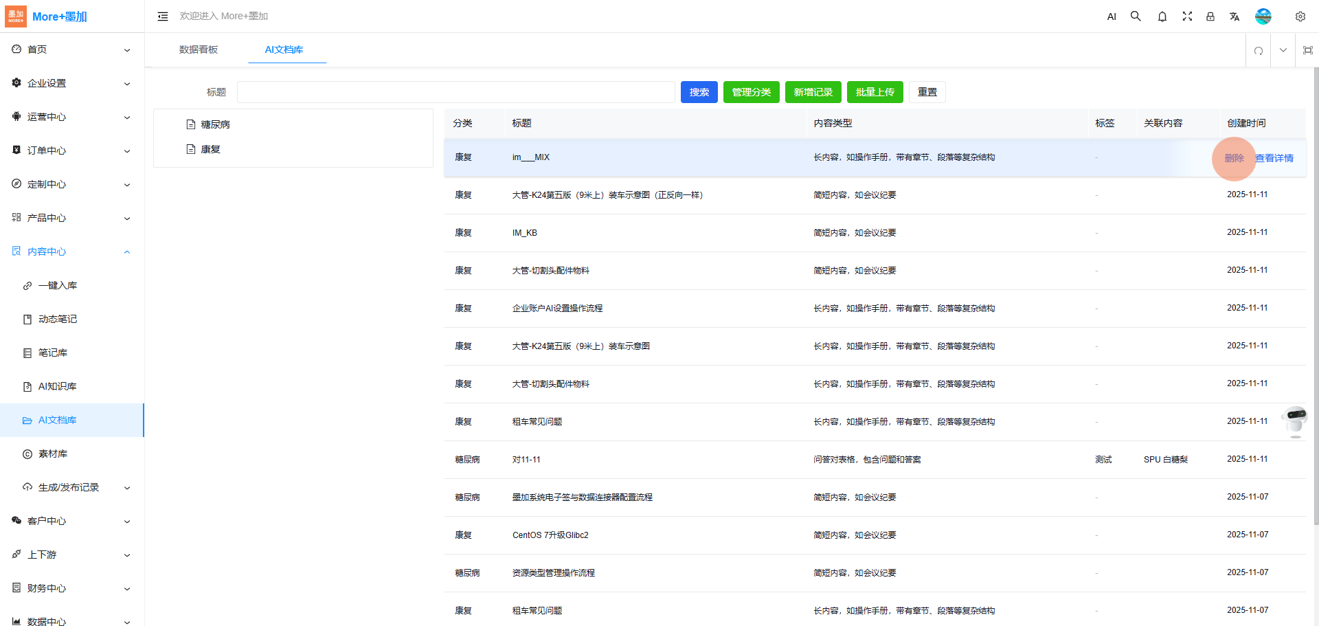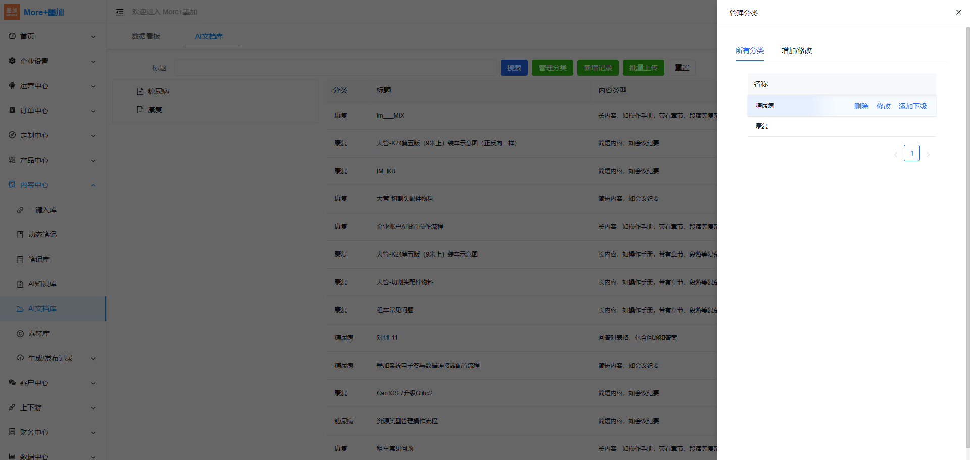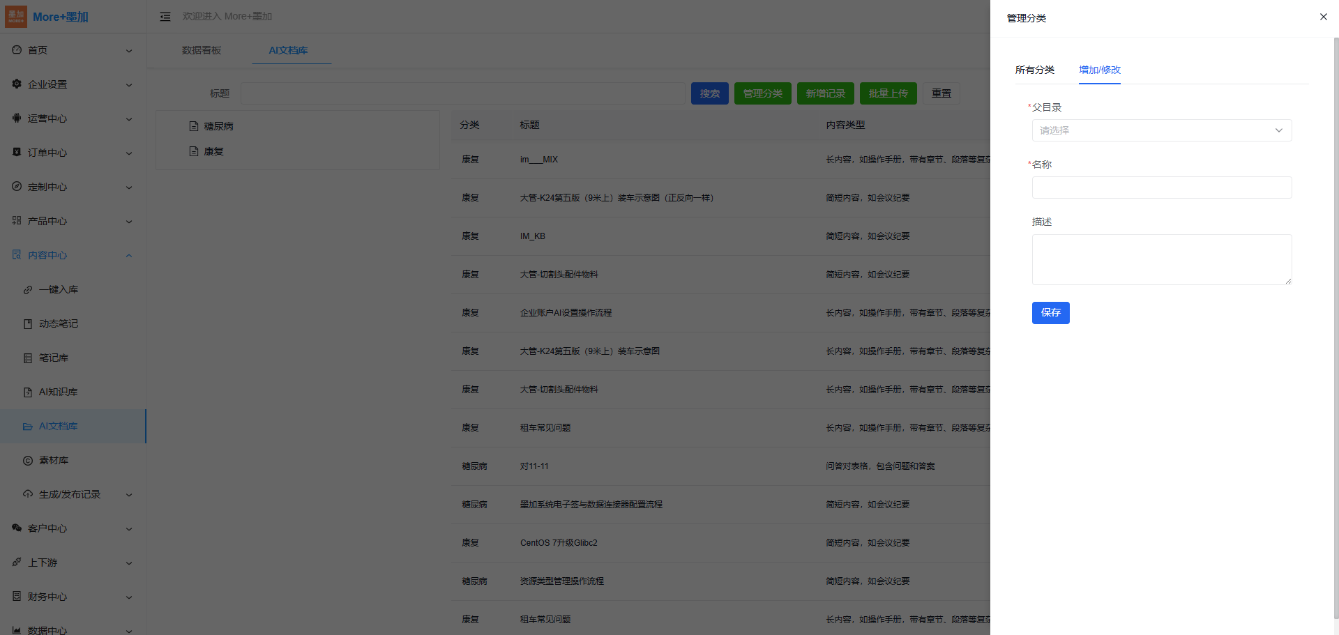 - 点击:【内容中心-文档库】,主要功能在于完善AI大模型的文档库,在AI客服或者客服助手在咨询相关产品时,AI会优先匹配知识库和文档库内的数据进行回答。文档库可以进行增加、删除、修改、查询、管理分类、和批量上传功能。