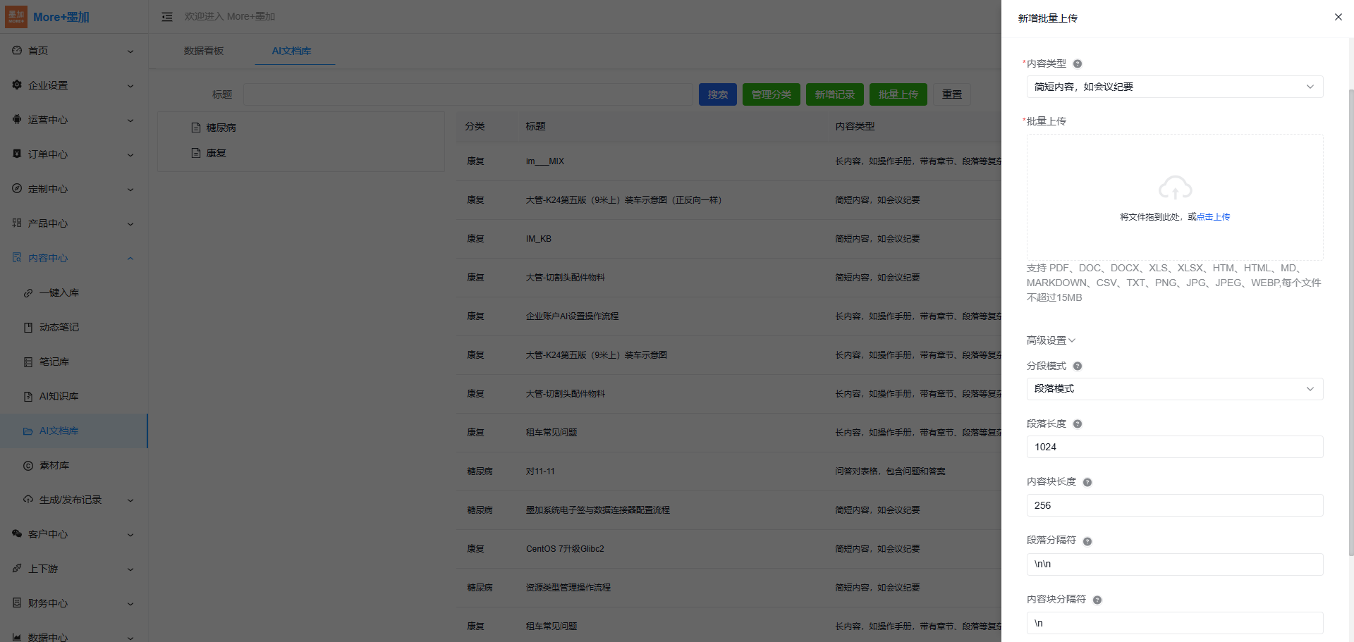 - 点击【批量上传】后可上传多个文档,会读取文档内的数据作为文档库的条目