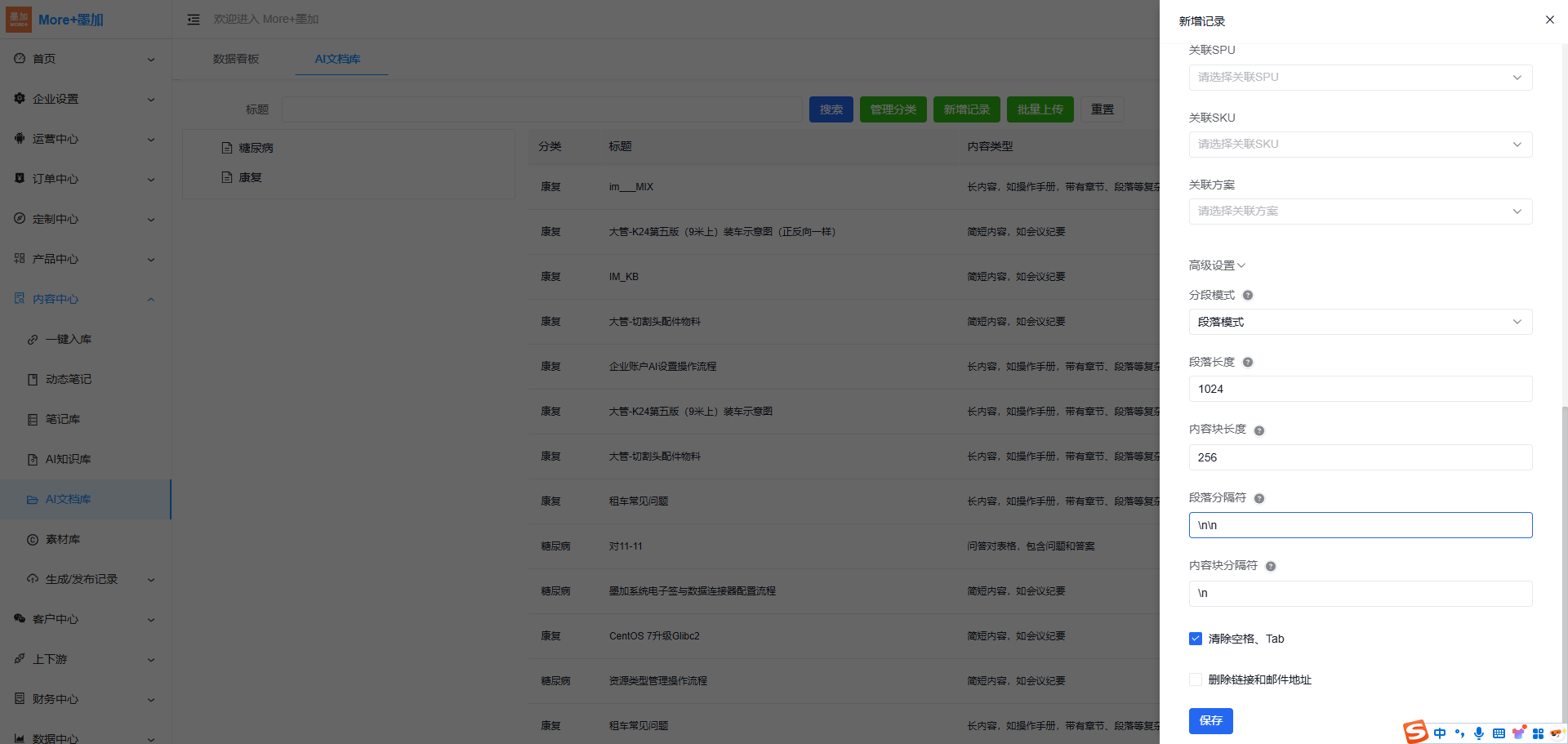 - 点击【新增记录】时可以新增一条AI文档库数据