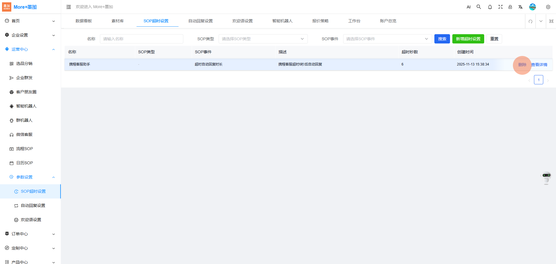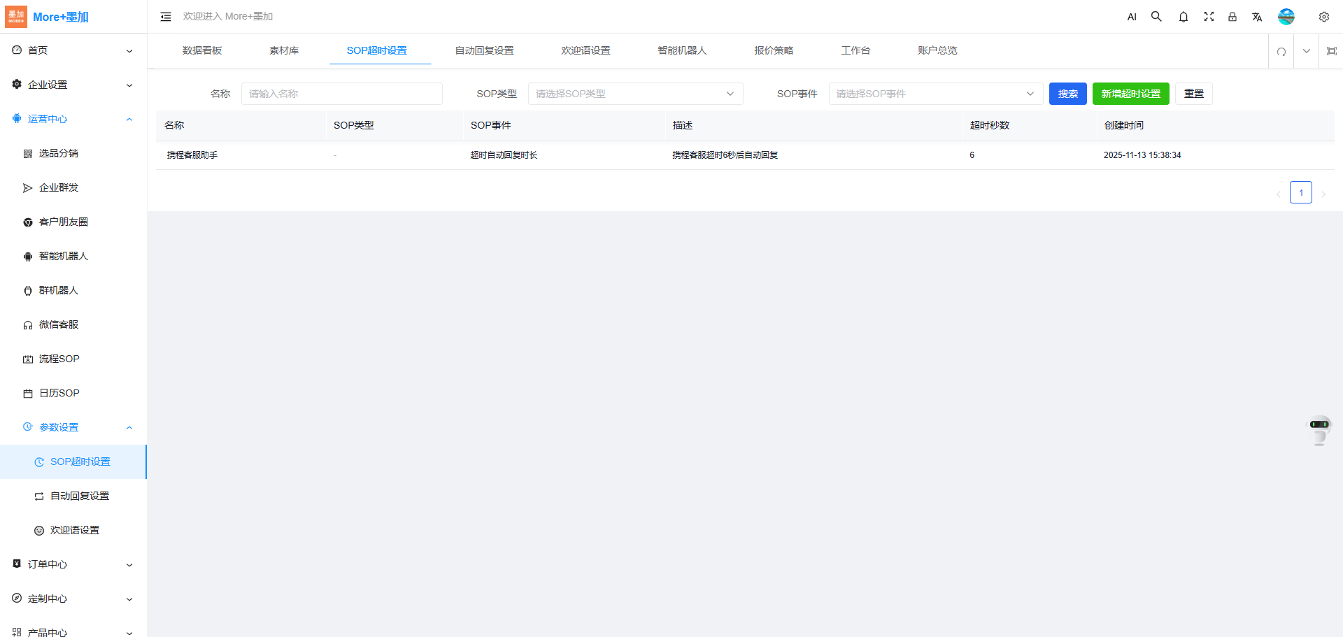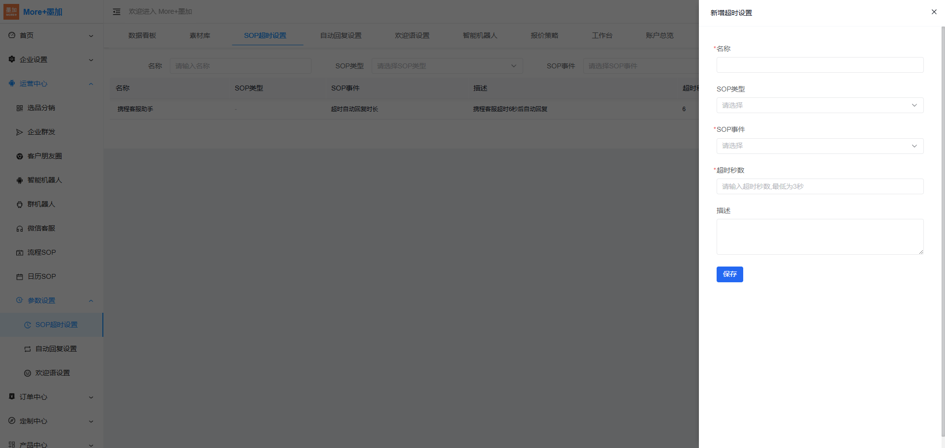 点击:【运营中心-SOP超时设置】主要支持在第三方平台使用客服助手时,客服超过设置的超时秒数后未回复消息时,会通过企业微信给对应人工客服推送消息回复超时提醒,帮助企业提升客户服务质量。
