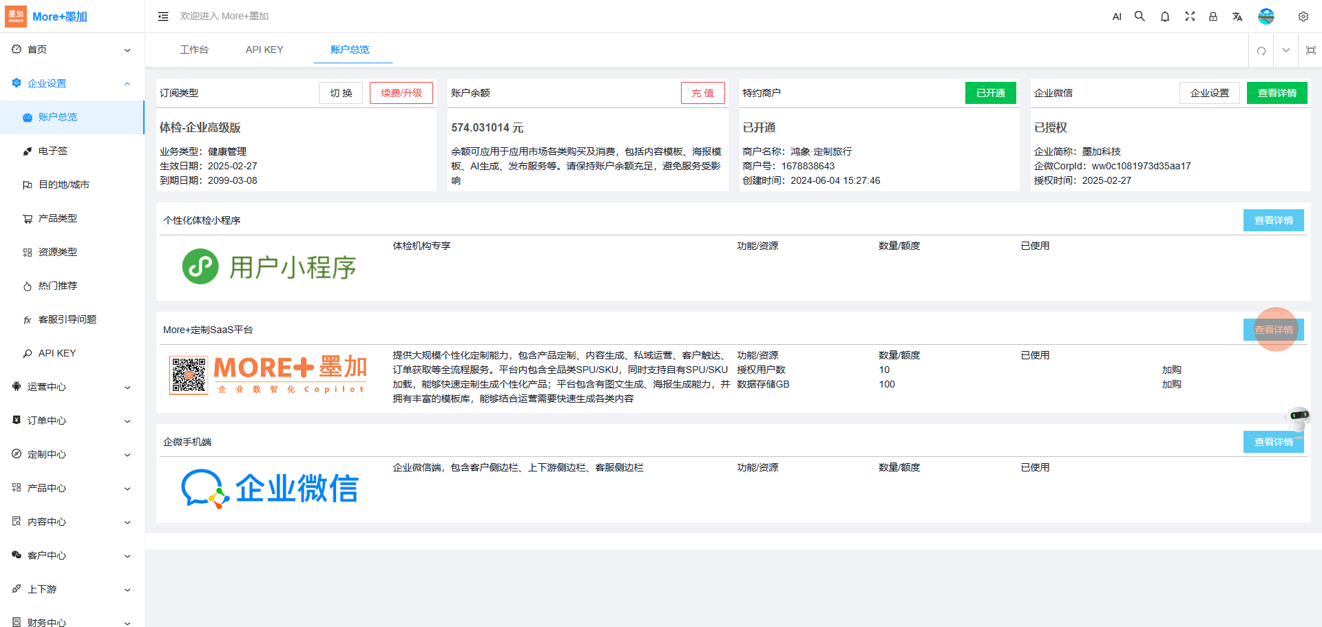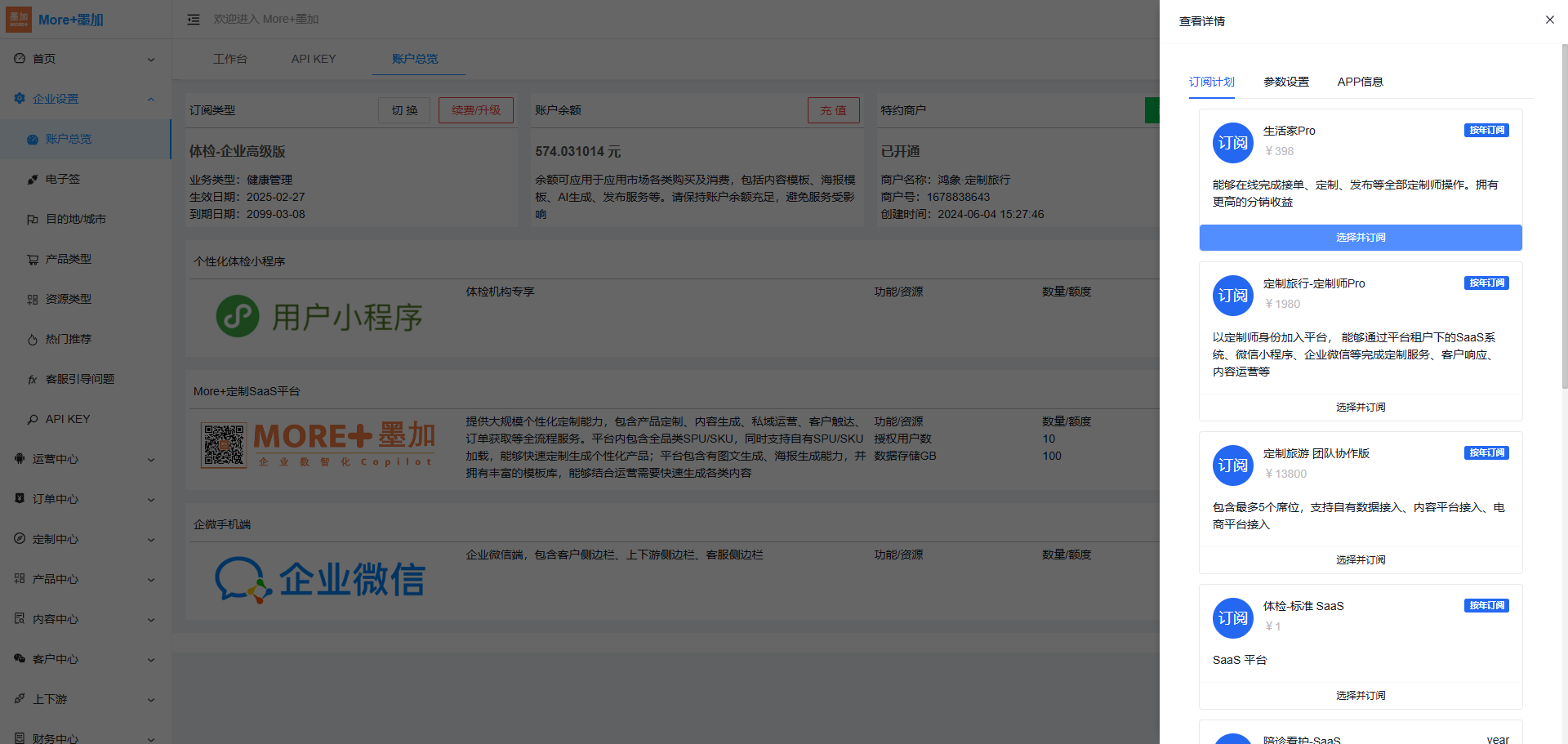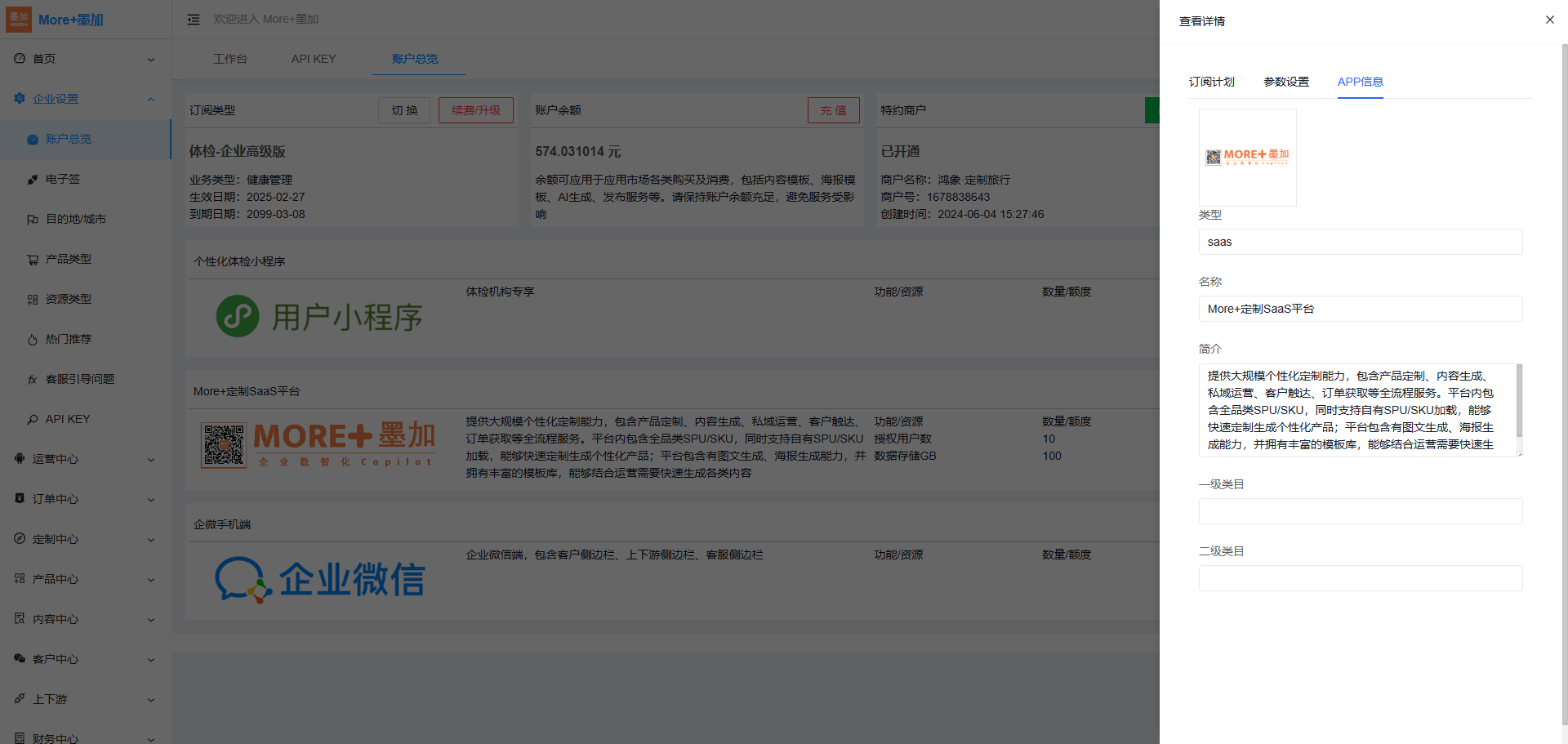 1.点击:【企业设置-账户总览-SaaS平台】,可以设置查看SaaS平台的订阅计划、参数设置、与APP信息