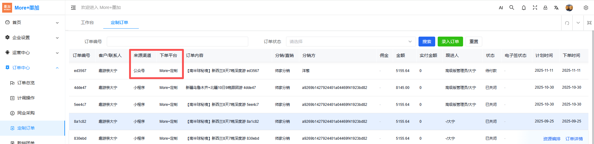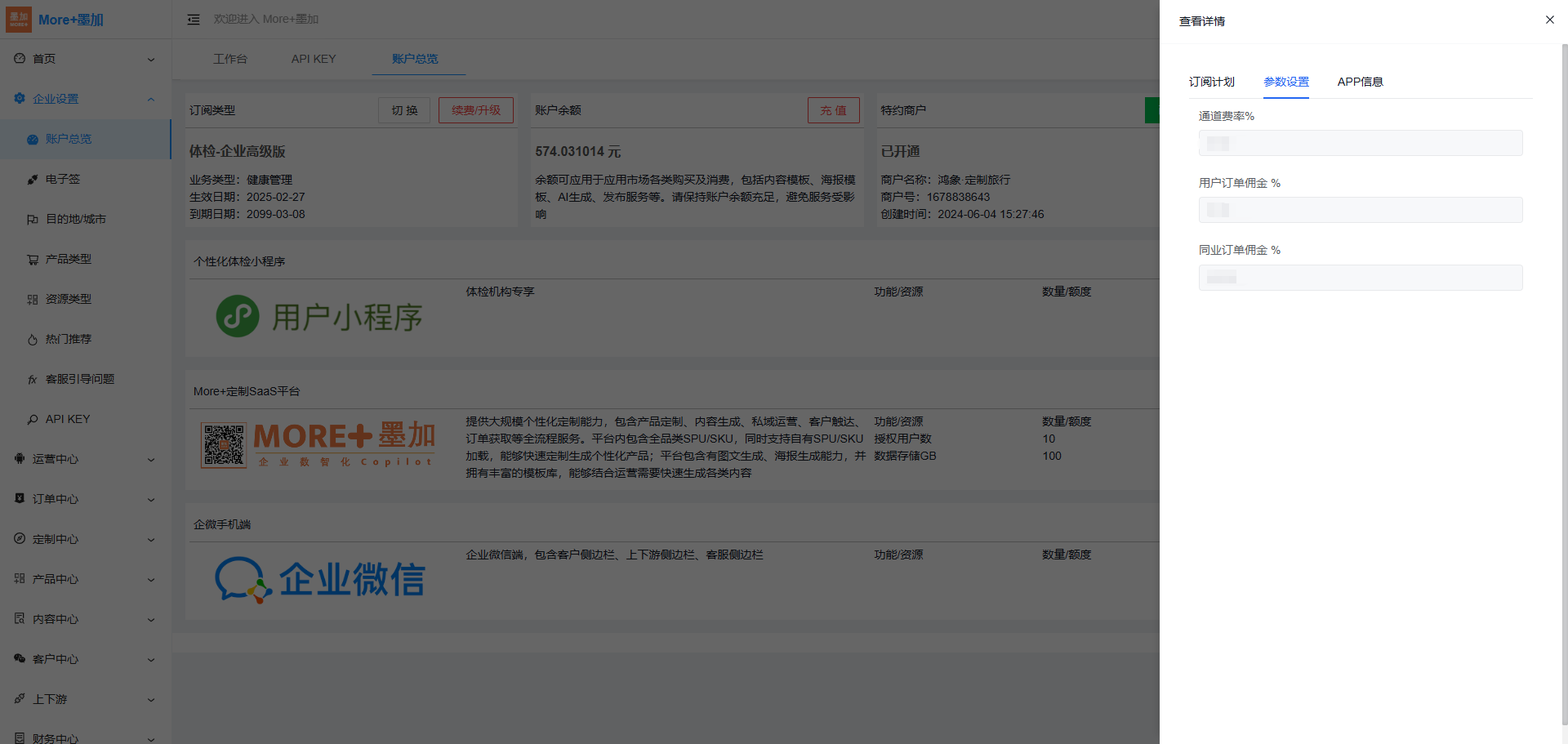 1.2 点击:【参数设置】,可以查看或设置SaaS平台对应收取的通道费率(微信收取的通道手续费)、用户订单佣金(来源渠道为公众号和下单平台为More+定制的用户订单会收取技术服务费)、同业订单佣金(同业分销模式下墨加平台收取供货商的同业订单技术服务费)