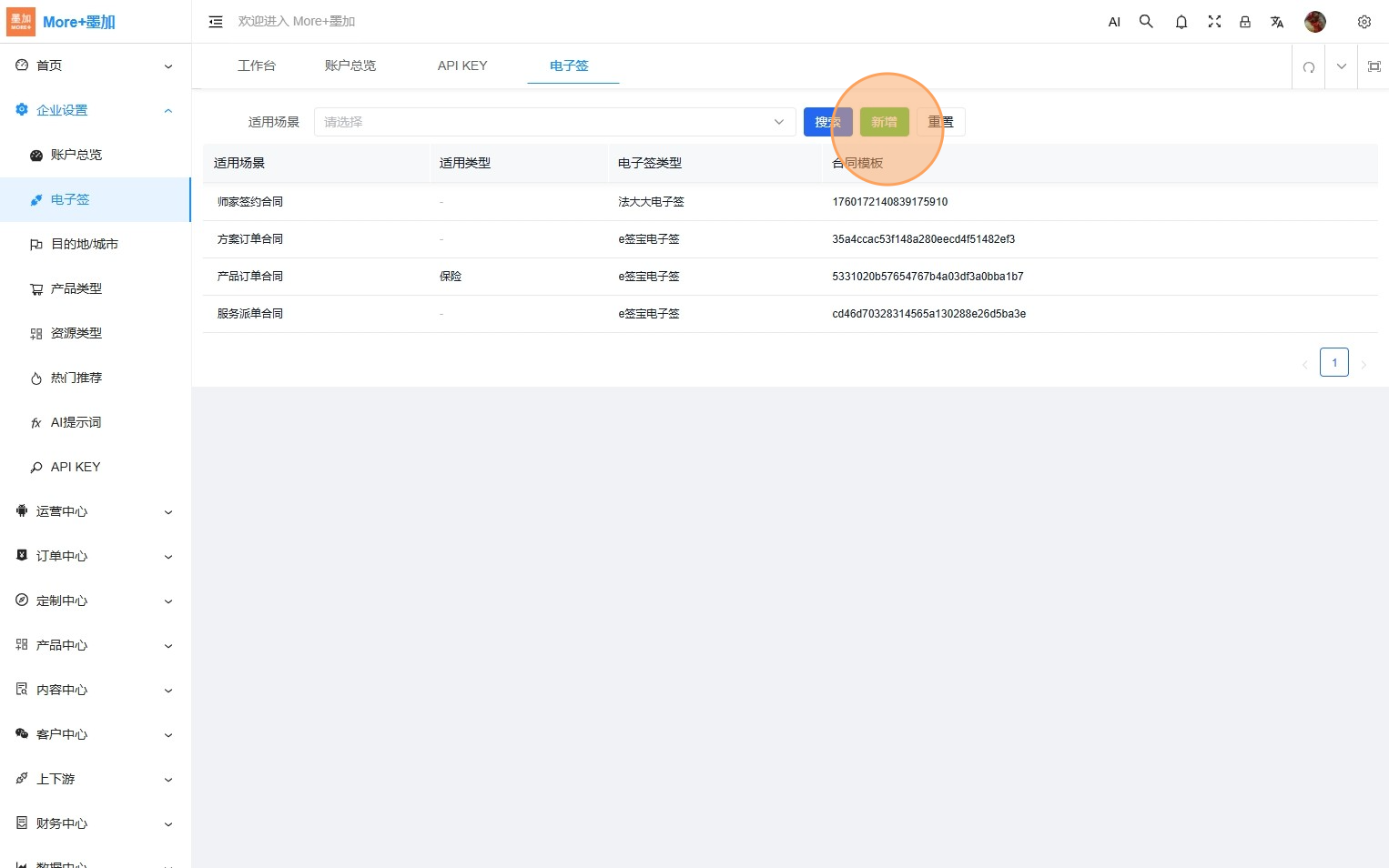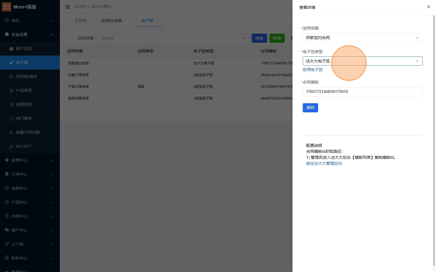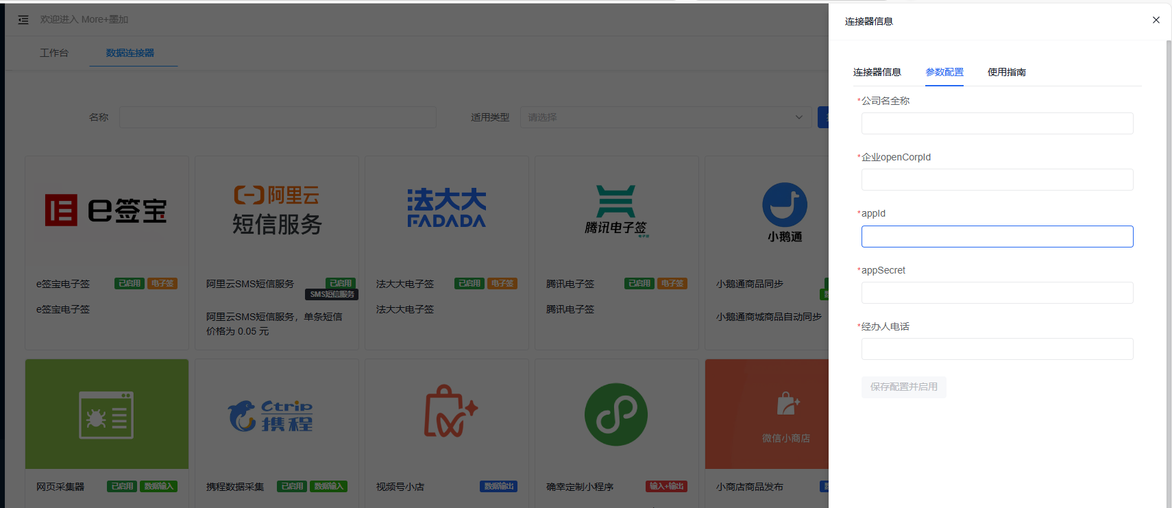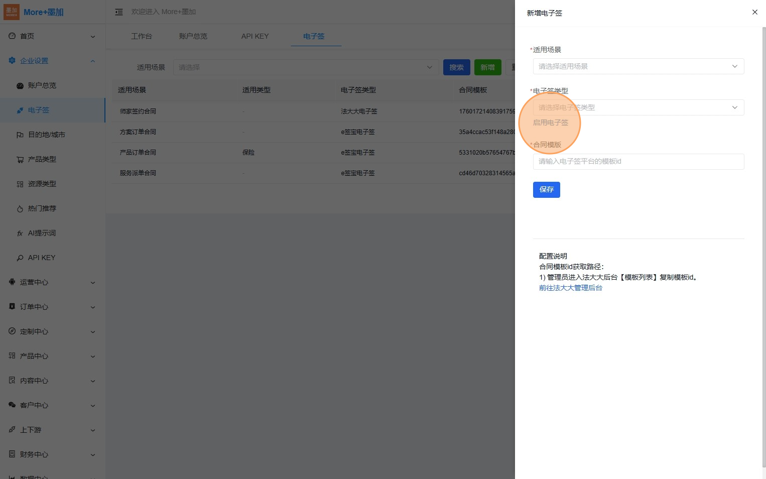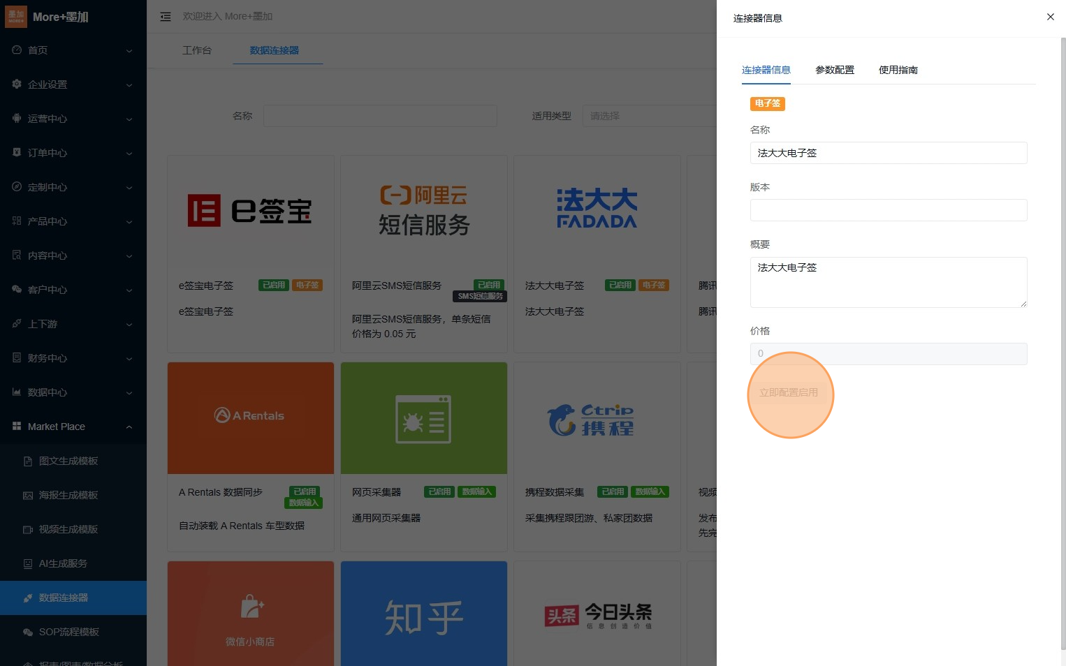 点击: 【启用电子签】,进入到【数据连接器】,开启电子签;目前已接入法大大、e签宝、腾讯电子签;具体启动哪家的电子签根据自己实际业务;