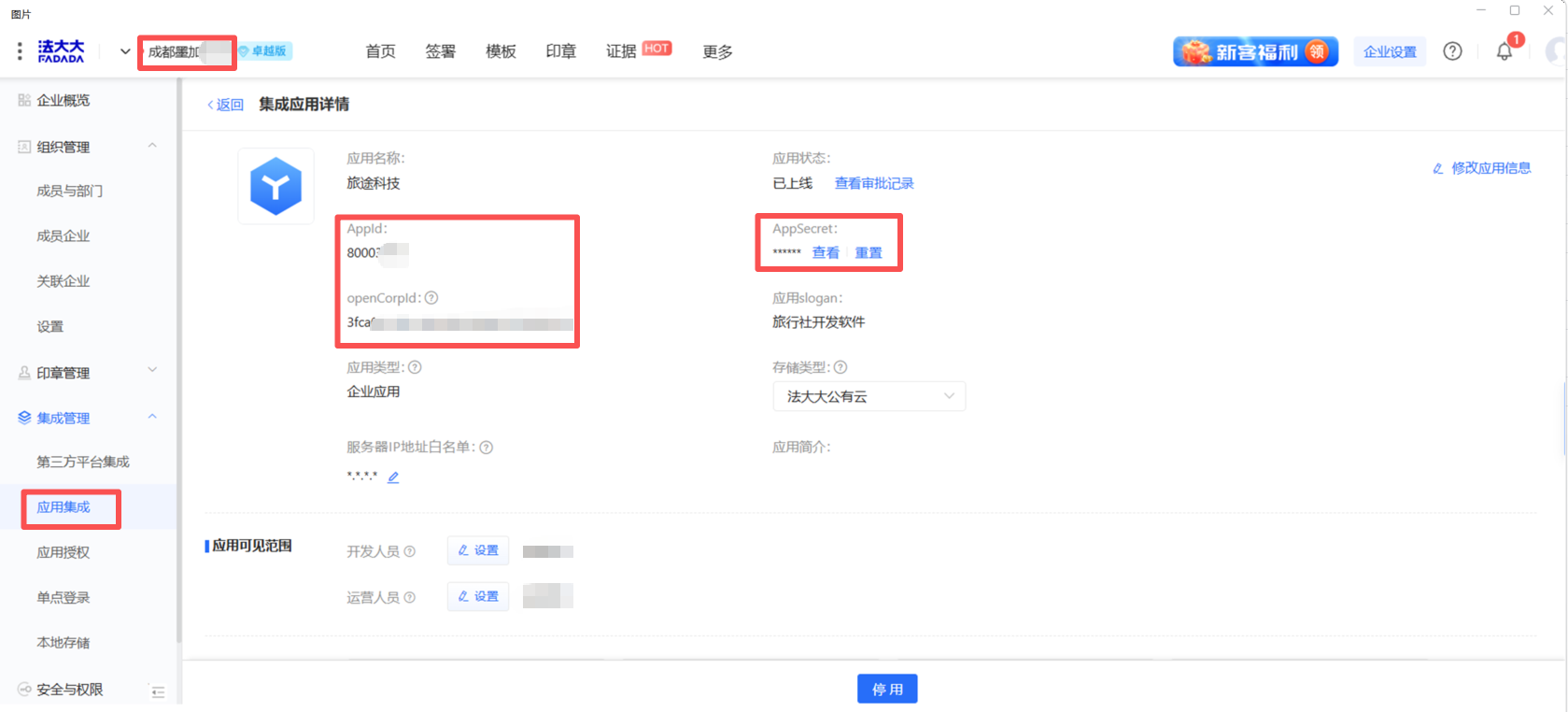 法大大参数配置获取,需要进入法大大平台【企业设置-应用集成】获取参数:企业openCorpId、appid 、appSecret