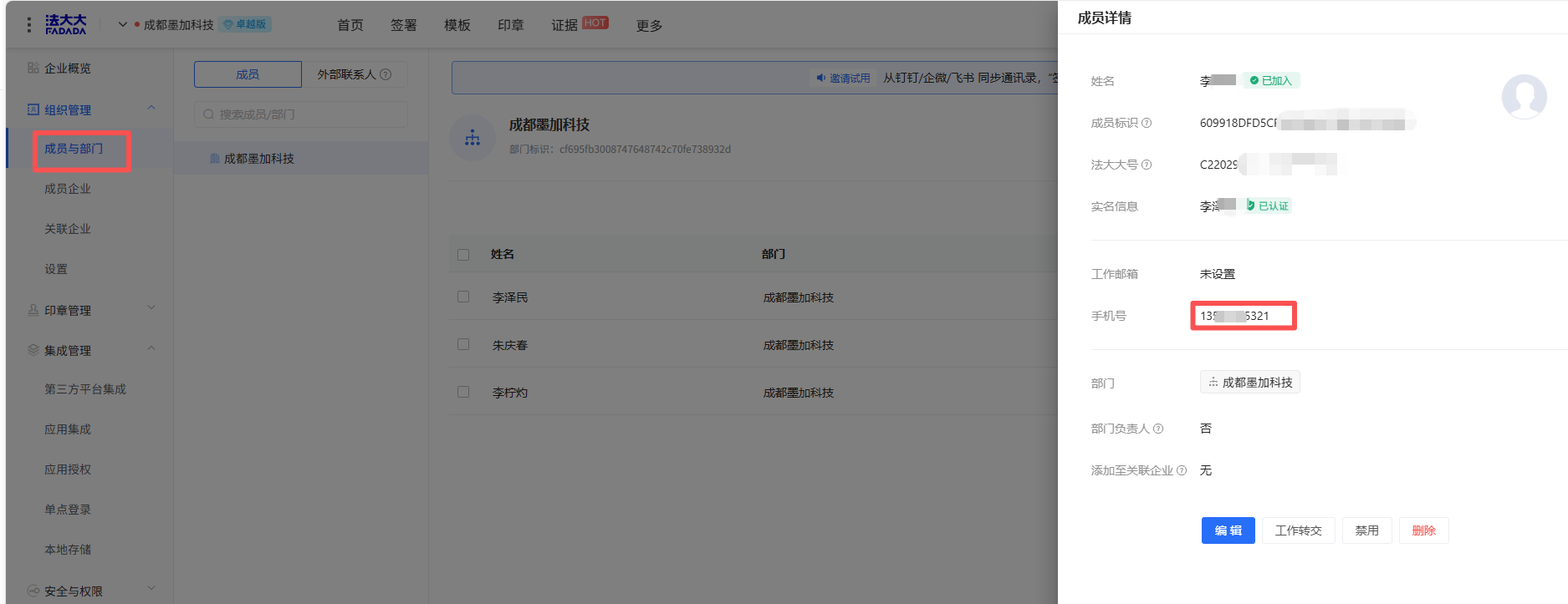 法大大经办人电话获取位置如下图;进入【企业设置-成员与部门】详情页面获取手机号