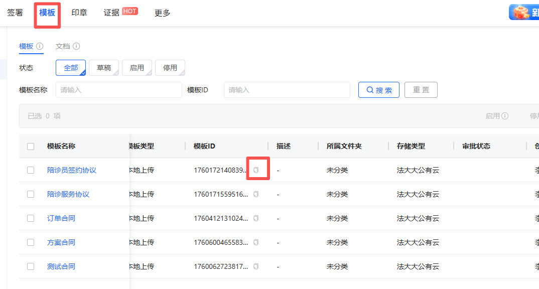 - 合同模板的id:需要进入法大大|腾讯电子签平台【模板列表】右侧获取对应id