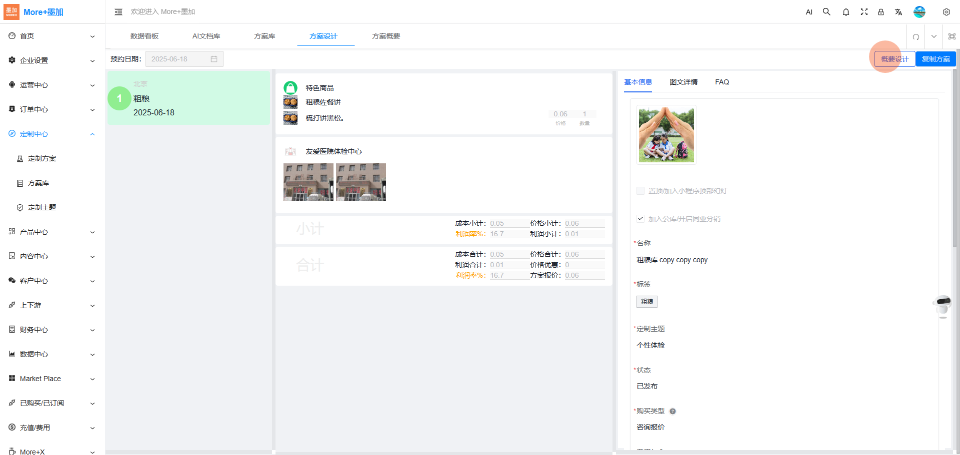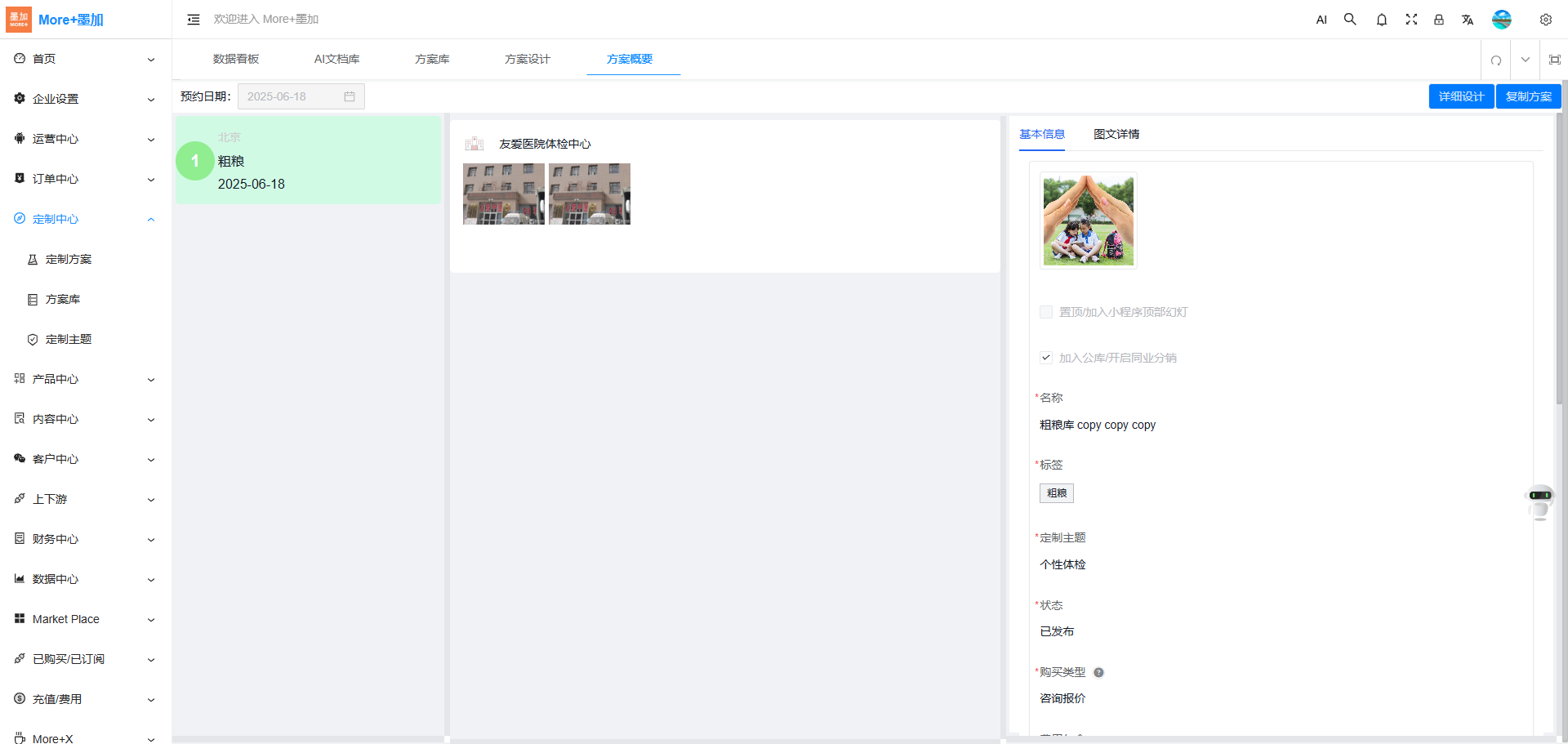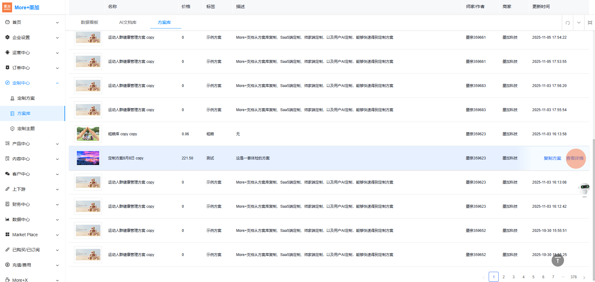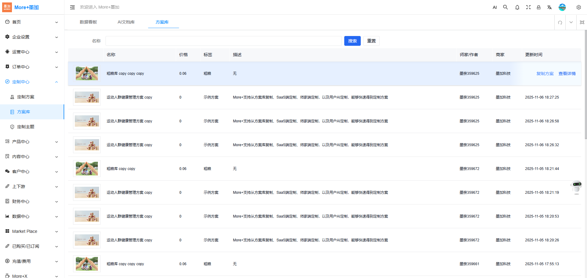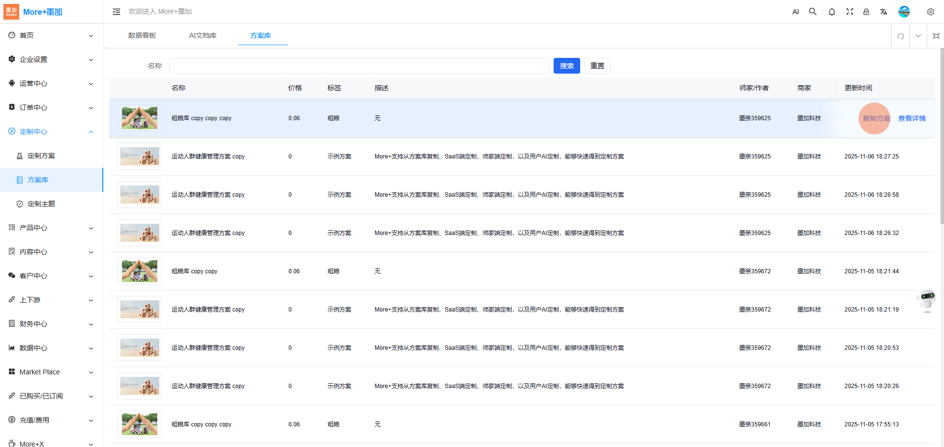 - 点击:【定制中心-方案库】主要展示所有加入到公库的方案都会在方案库列表中,在方案库中提供了可以复制方案库的方案到当前用户的定制方案库中