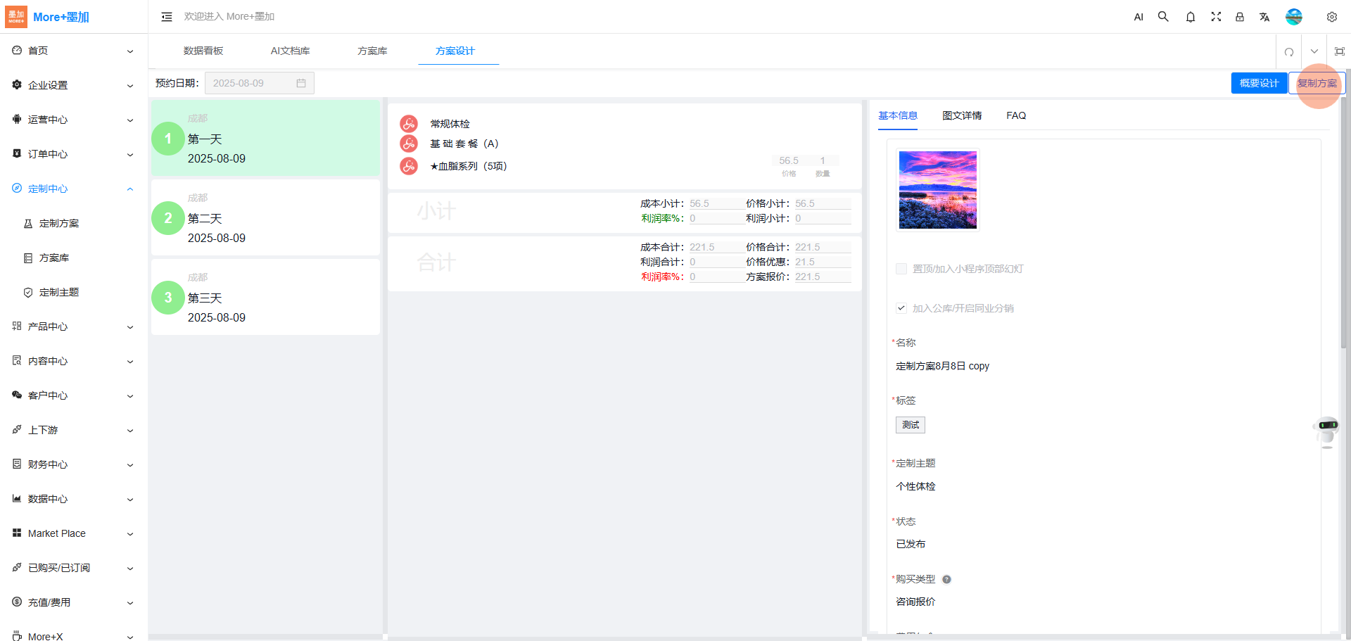 - 点击【查看详情】可以查看当前方案的详细信息,如每天的日程和日程下事项的价格,方案价格、方案名称、标签、定制主题类型、状态、购买类型等。