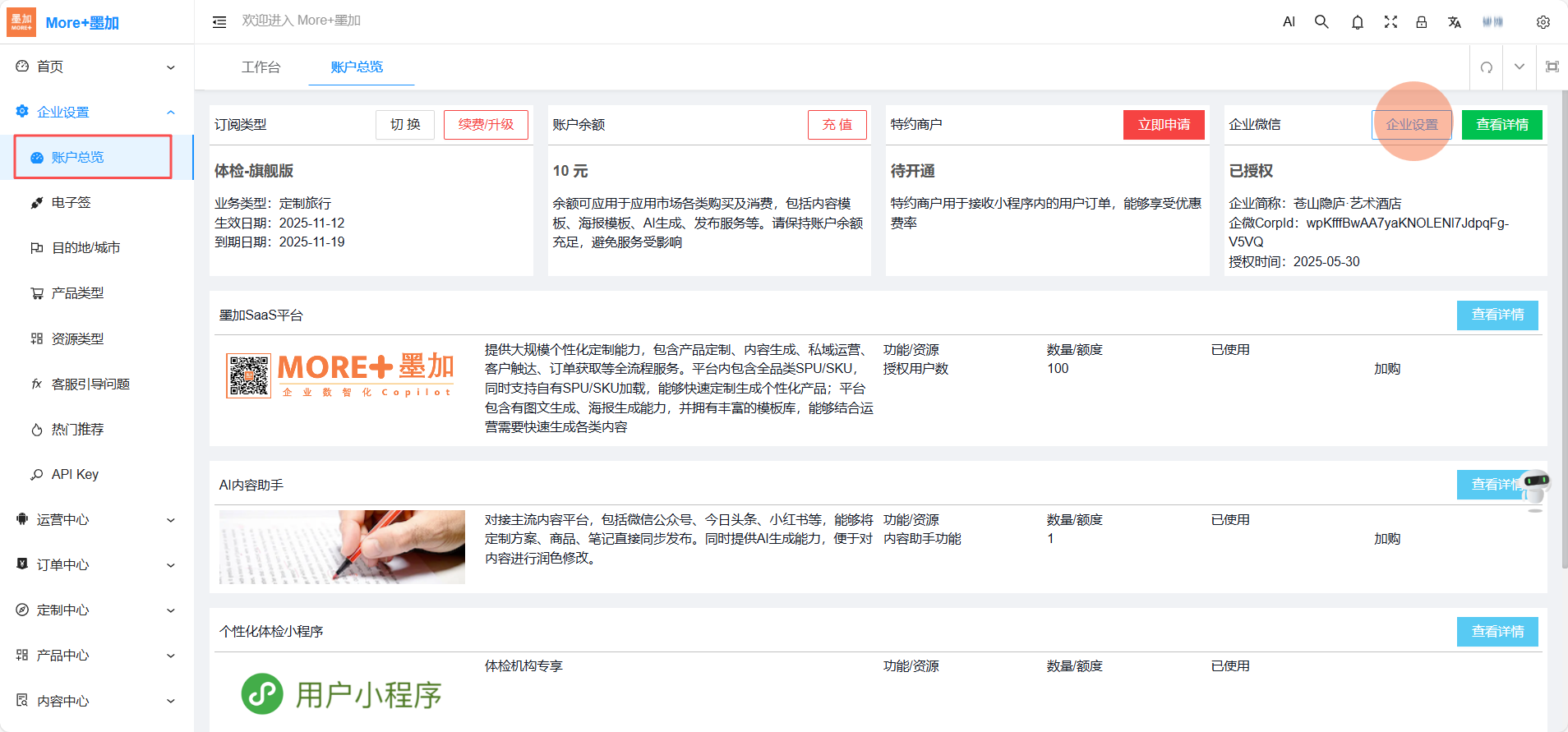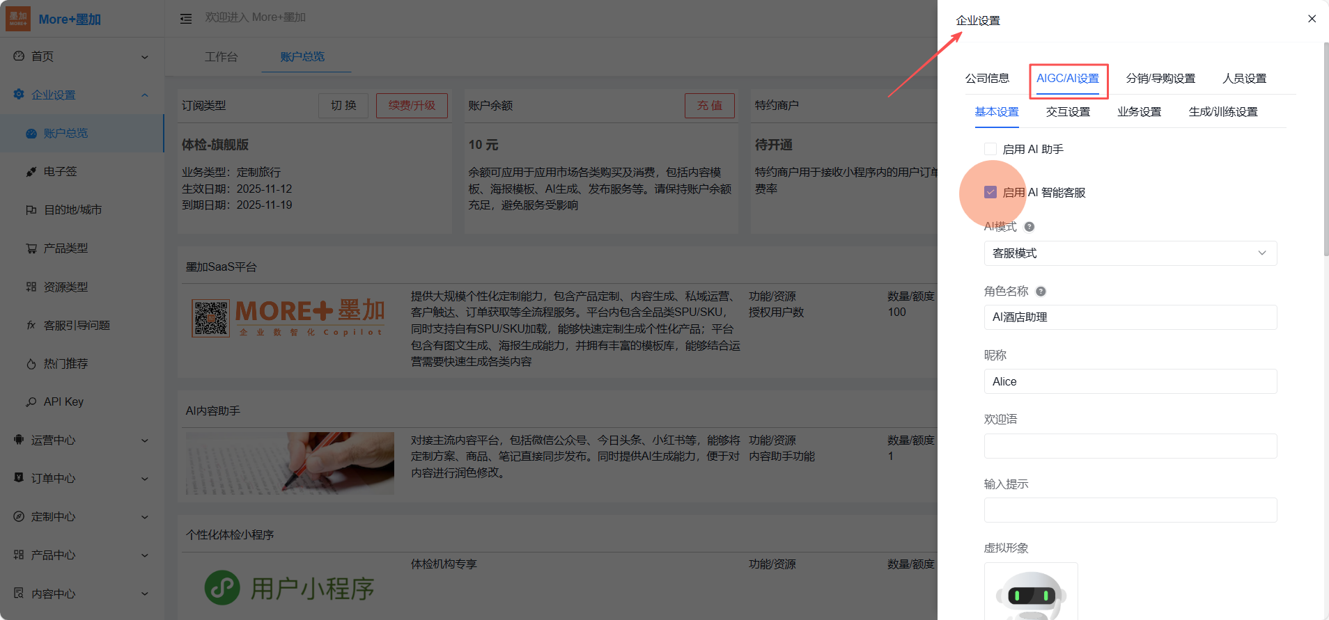 进入【企业设置-账户总览-企业微信-企业设置-AIGC/AI设置】,勾选是否【启用AI智能客服】