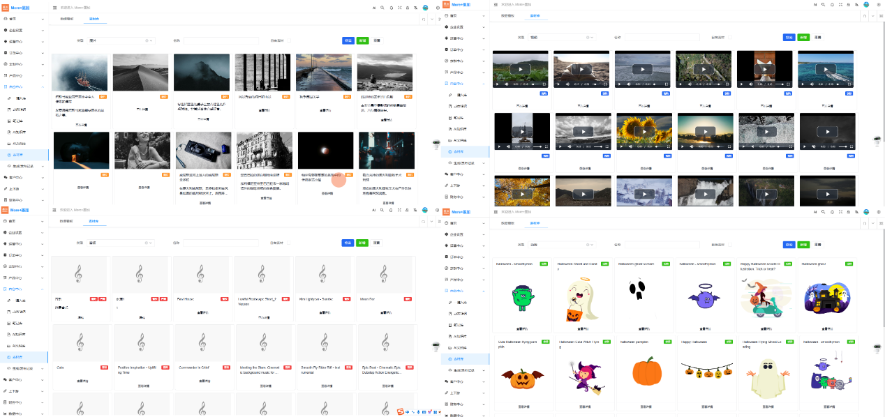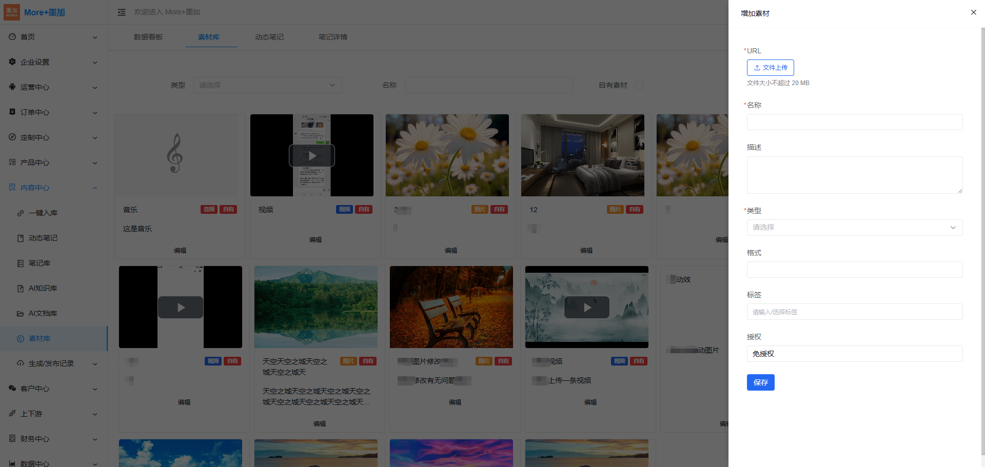 - 点击:【内容中心-素材库】主要是为动态笔记增加丰富的内容(图片、视频、音乐、动效),在把笔记内容发布到小红书、微信公众平台等第三方平台时能够给企业带来巨大的流量。也可在生成图文模版、海报模版、视频模版时提供高质量的素材,这样生成的效果就更加丰富,更加吸引人。