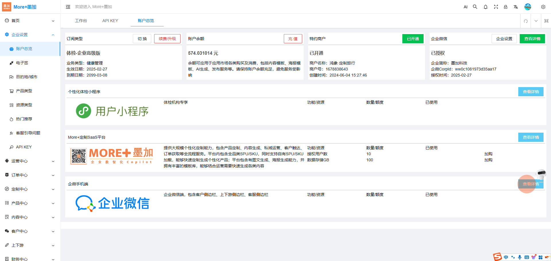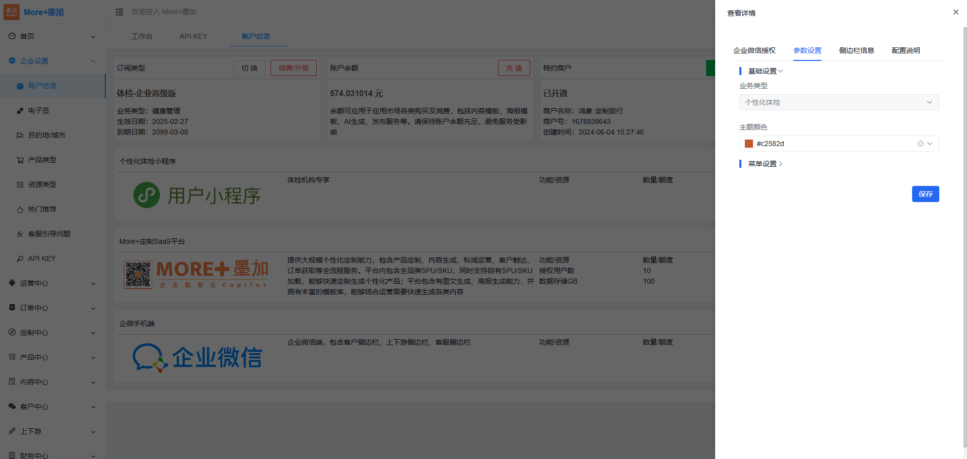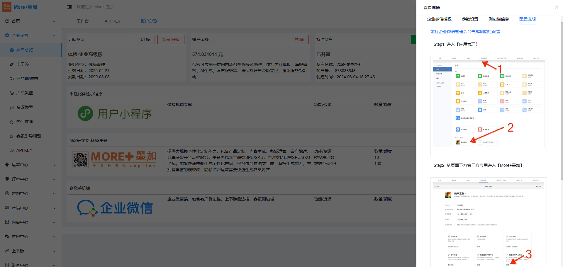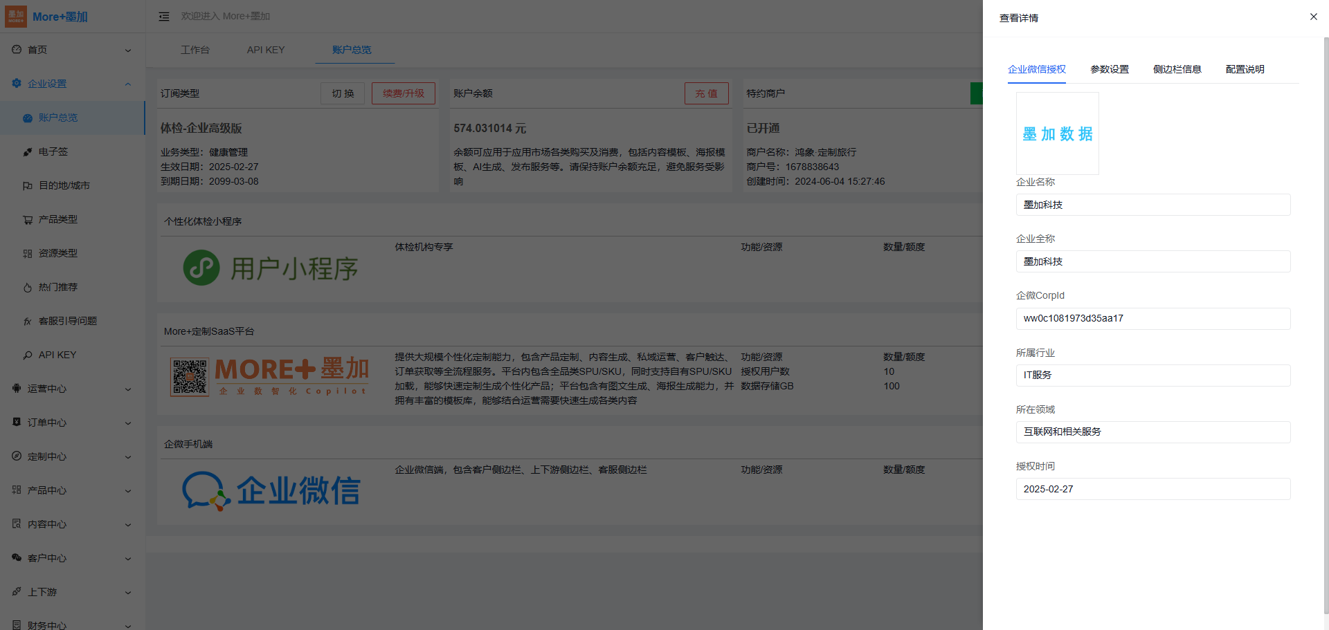 1.点击:【企业设置-账户总览-企微手机查看详情】,可以设置查看企业微信授权信息、参数设置、侧边栏信息、配置说明