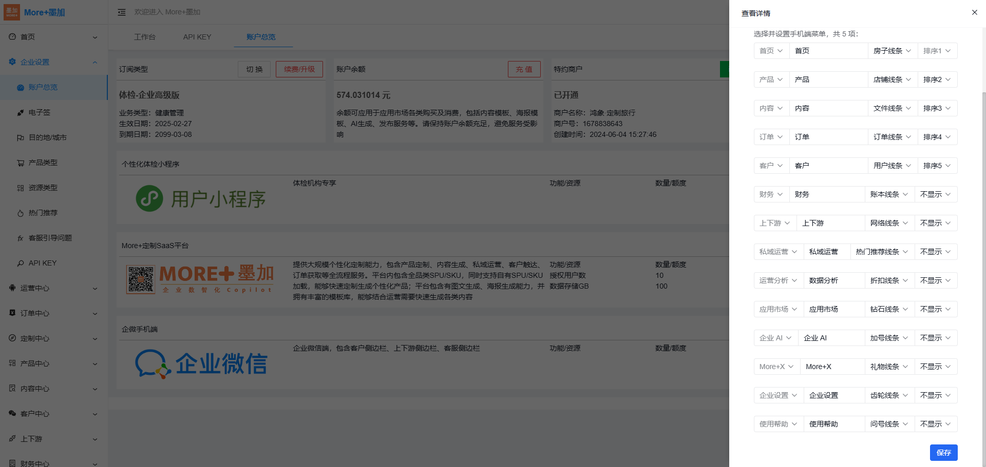 1.2.2点击:【参数设置-菜单设置】,可以设置企业微信的手机端的菜单展示数量、和菜单排序、菜单图标修改、菜单名称修改等功能